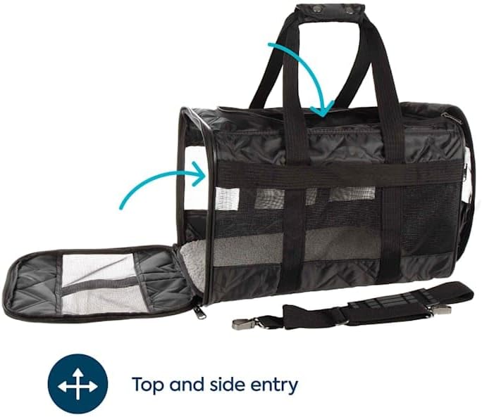 Convenient Features: Removable adjustable shoulder strap and handles with a comfortable grip wrap; top and side entries for easy and preferred pet loading and exit; flexible frame to fit under plane seats; plastic feet to keep carrier bottom from the floor; moisture barrier to prevent leaks