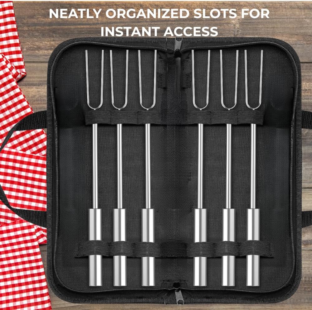 SET OF 6 HIGH-QUALITY, EXTENDABLE ROASTING STICKS: Made of stainless steel and non-toxic, these s’mores sticks are rust-resistant and safe for roasting. The telescoping design makes these skewers for smores perfect for camping or backpacking.