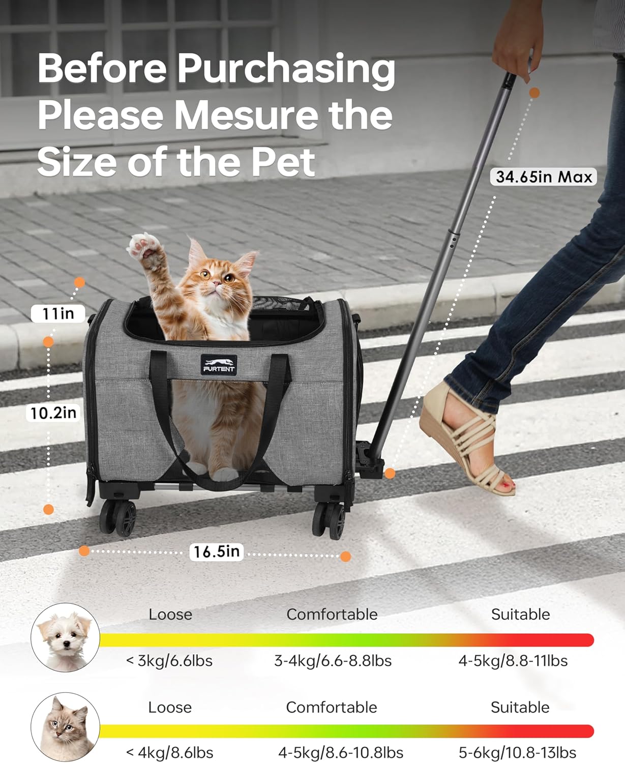 【AIRLINE-APPROVED】Certified by several airlines for in-cabin use (To ensure your flight is smooth, please check your airline’s pet policy before travel). Pet carrier size: 16.5in*11in*10.2in (without wheels). We recommend that the dog weight under 11lbs and cat weight under 13lbs. Please choose the carrier based on your pet’s length and height, not just weight.