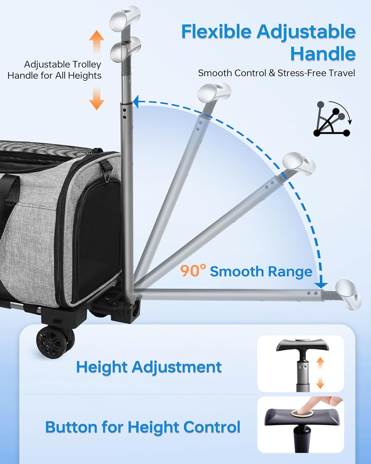 【SUPERIOR VENTILATION AND STORAGE】The pet carrier with wheels adopts high-density mesh on four-sided promotes air circulation and clear visibility, while the side zipper window lets you comfort your pet mid-flight or on the go. The cat carrier with wheels equips zipper pockets for easy access to snacks, pet supplies, or personal items.