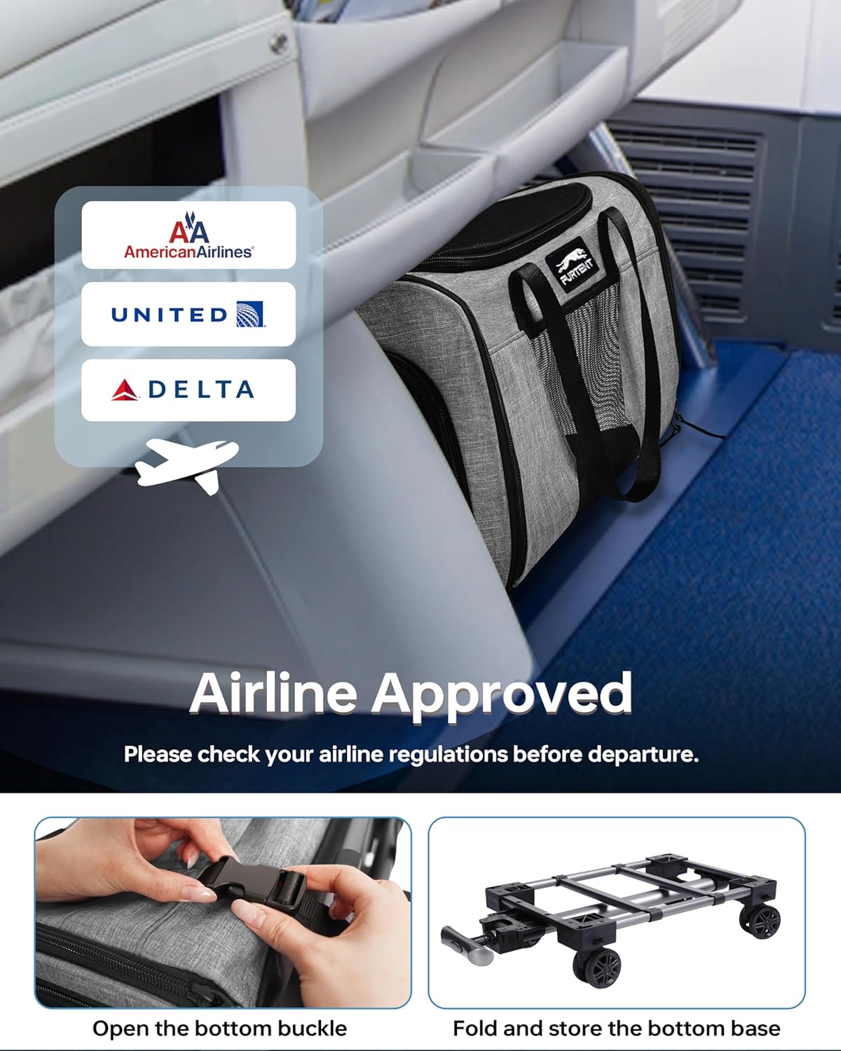 【AIRLINE-APPROVED】Certified by several airlines for in-cabin use (To ensure your flight is smooth, please check your airline’s pet policy before travel). Pet carrier size: 16.5in*11in*10.2in (without wheels). We recommend that the dog weight under 11lbs and cat weight under 13lbs. Please choose the carrier based on your pet’s length and height, not just weight.