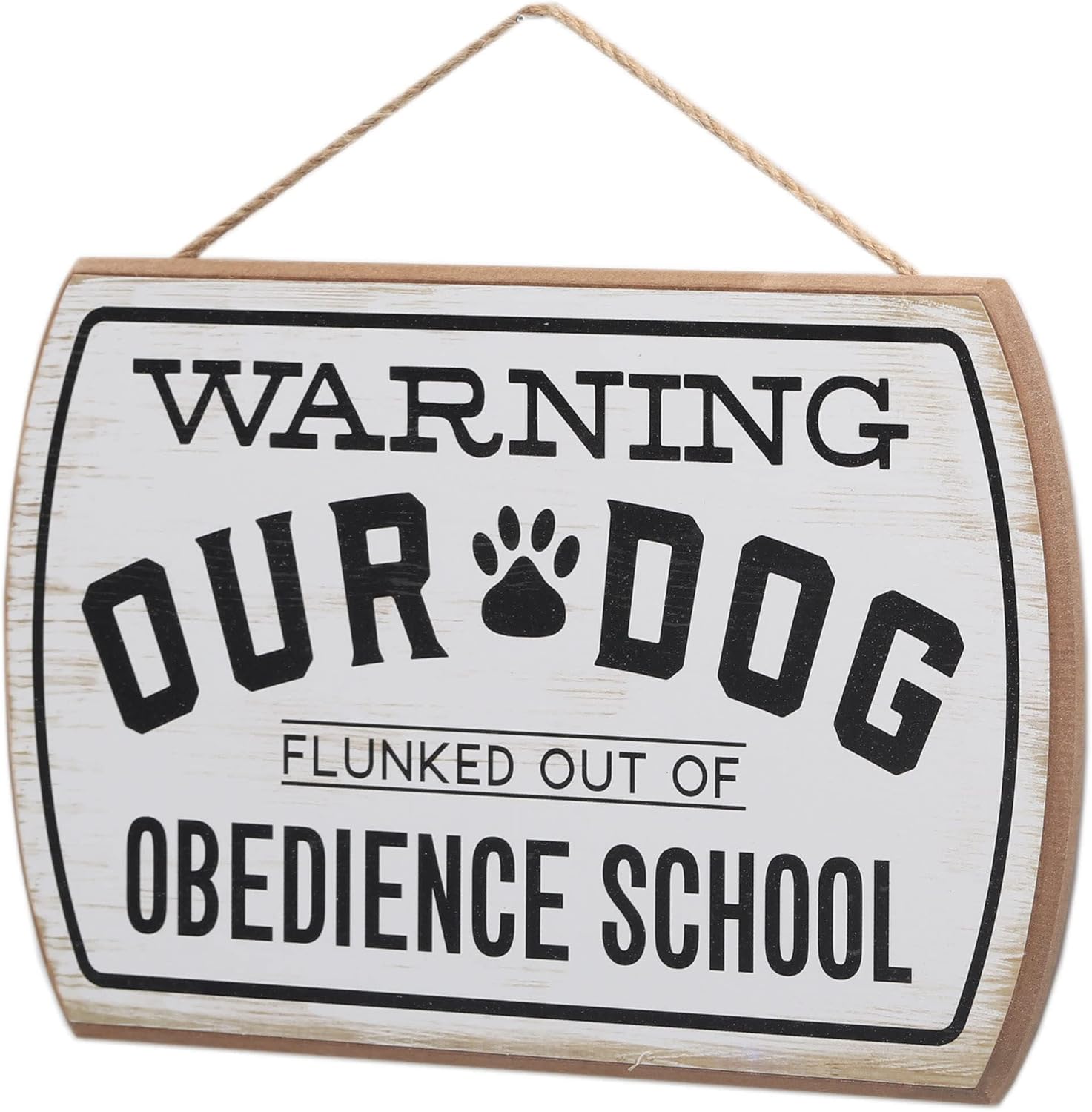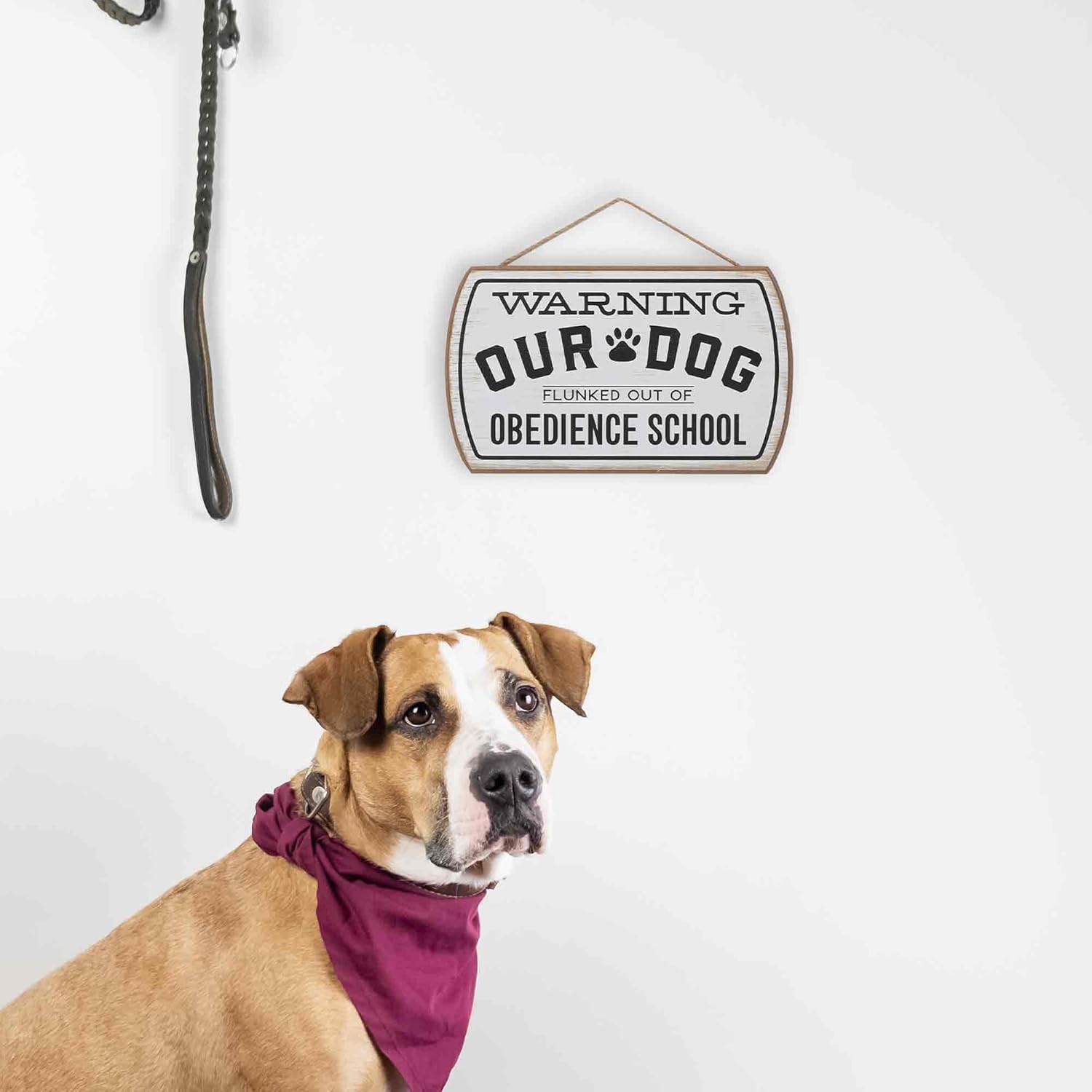 Fun Vintage Sign: Reading, “Warning – our dog flunked out of obedience school,” this wall art tells it like it is!
