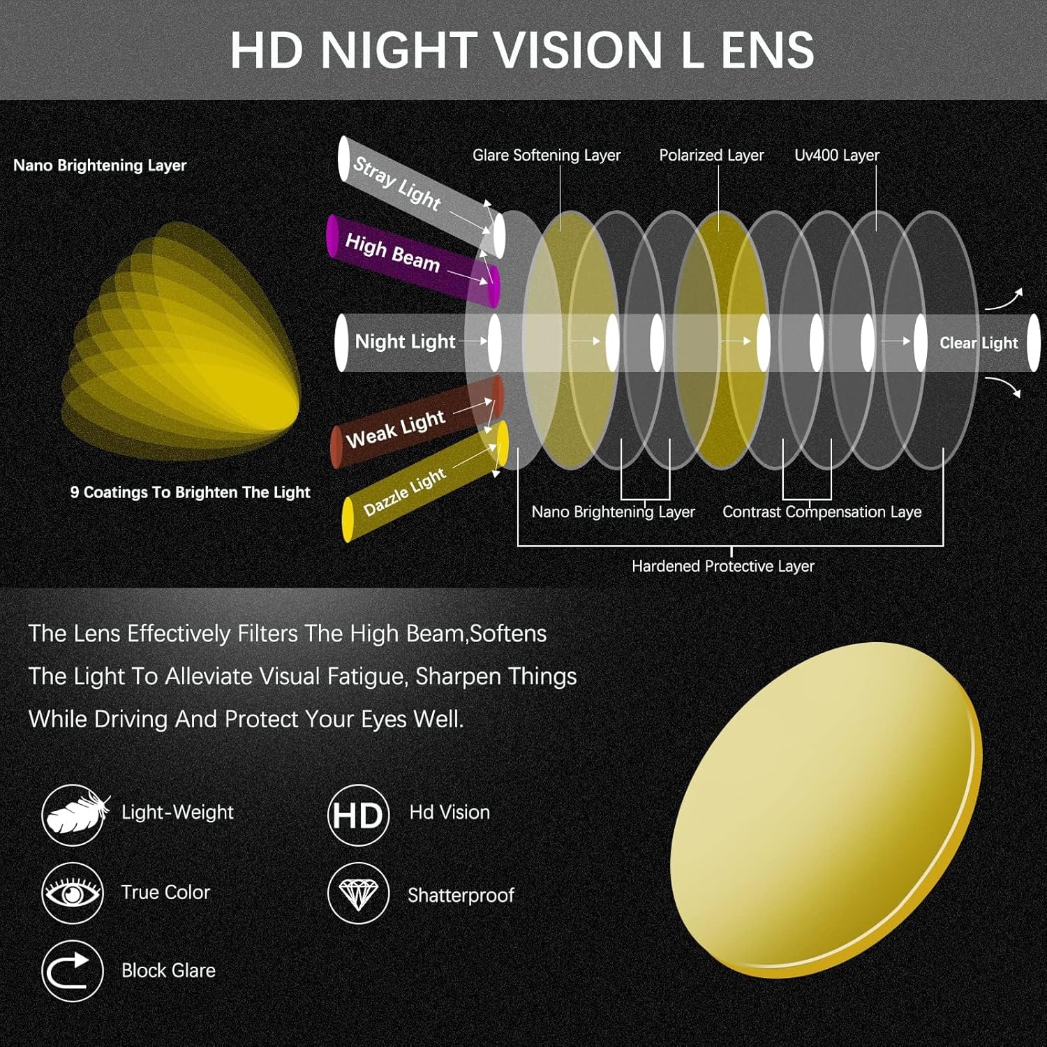 【Night Sight Hd Glasses】- Yellow Lens Glasses for Night Vision Lens is perfect for usage by driving. Especially provide more accurate vision when driving at night or cloudy, foggy,rainy days, making driving more safe.