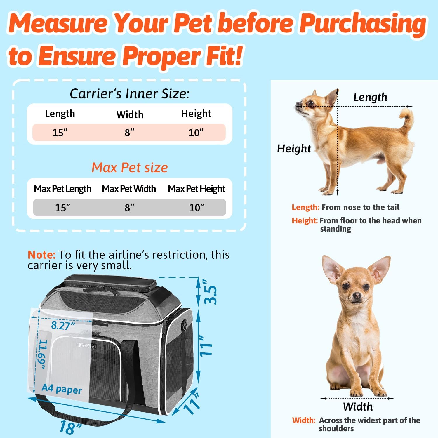 【CHECK SIZE BEFORE BUYING】In order to fit the under-seat dimensions of airlines, this carrier can only fit small dogs and cats. We recommend that the pet size you carry be within 15″L x 8″W x 10″H(this carrer’s inner size), please choose the carrier reference your pet’s length and height. Reference pet weight: dog weight under 10LBS and cat weight under 12LBS.