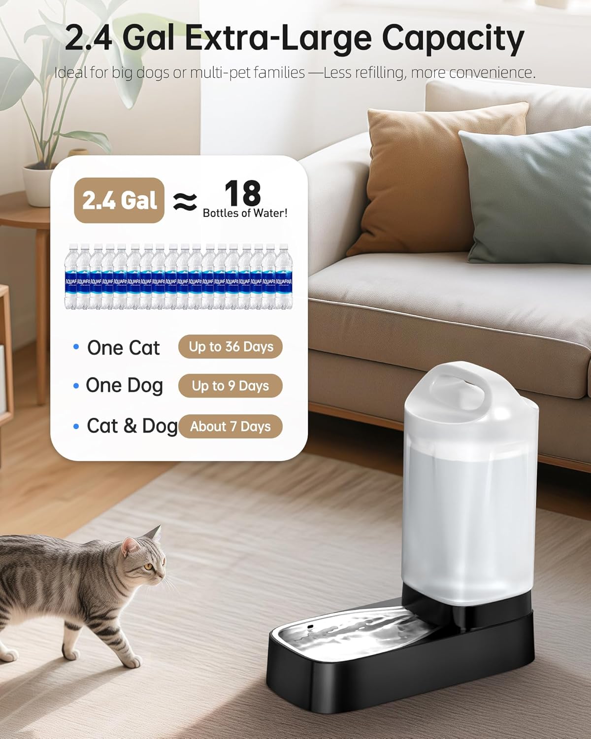 【2.4 Gallon Large Capacity – Fewer Refill】With 2.1 Gal in the water bottle and 0.3 Gal in the stainless steel bowl, this large capacity dog water bowl dispenser with ergonomic handle is a must-have for busy pet owners, multi pet households, large dogs or cats, and high-drinking breeds. Designed for dog water bowl refilling via gravity, it ensures a steady water supply throughout the day without constant monitoring. Less checking, less refilling.