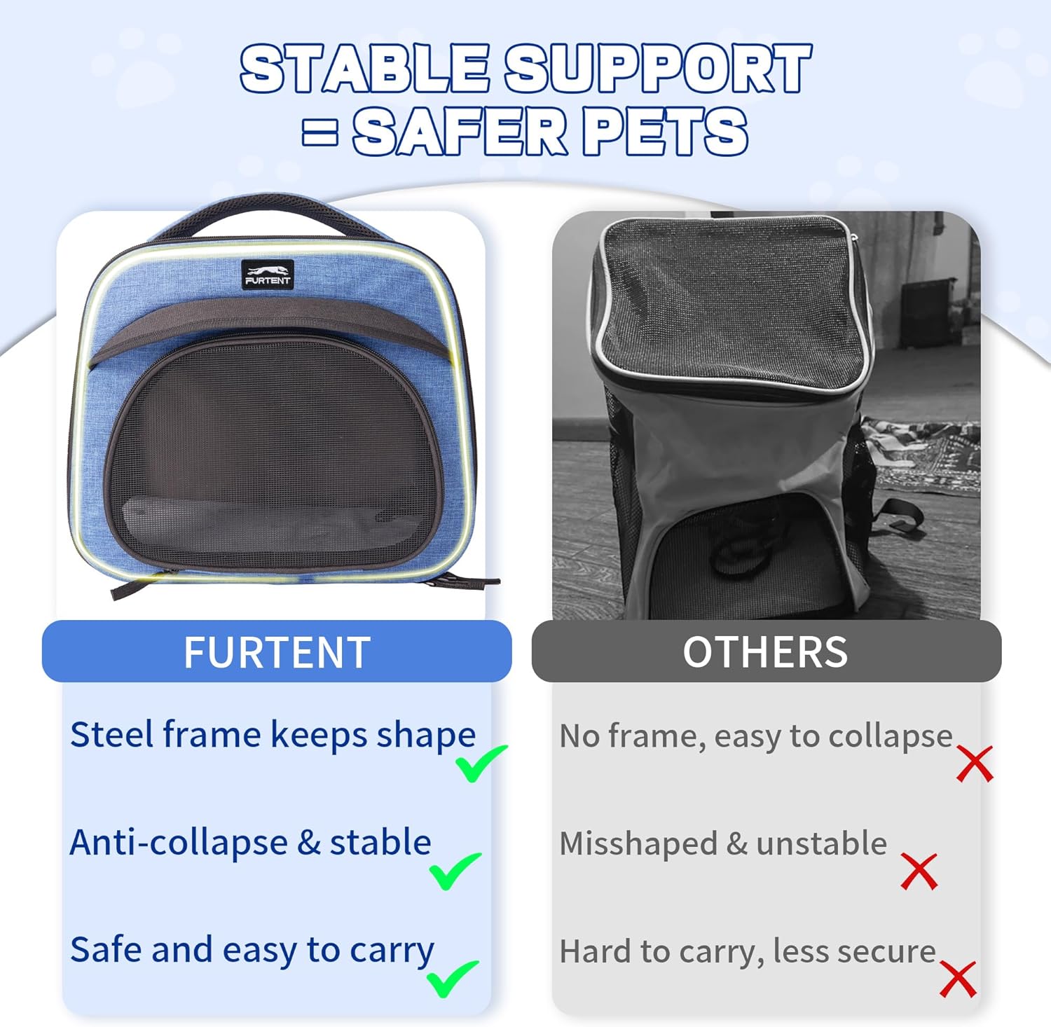 【STURDY & DURABLE】FURTENT Small Pet Carrier is made of high-density 900D Oxford fabric, with excellent anti-scratch, waterproof, and dustproof performance, resistant to daily wear and outdoor conditions. The bag features a built-in 2.5MM support skeleton, keeping the structure stable without collapse or deformation, whether for short trips or long use, providing your pet a comfortable and secure space on the road.