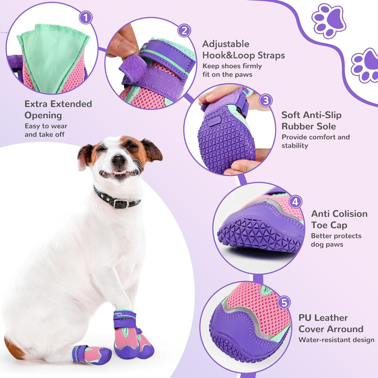 All-Weather Protection: Our dog boots are built to handle every season! The PU leather toe cap is waterproof to shield your dog’s paws from rain, snow, and mud, sharp objects harm, while breathable mesh can keep them cool in summer and protect dogs from licking their paws