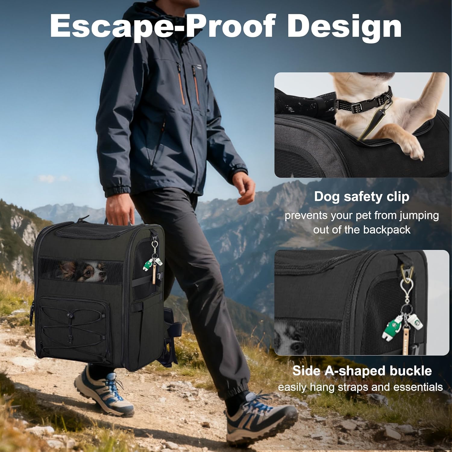 【Secure Design to Prevent Escaping】Built-in solid safety clip attaches firmly to your pet’s collar/chest strap, stopping sudden escapes during hiking or vet visits. Adjustable shoulder straps & waist belt keep the backpack stable—no shifting when climbing or walking on uneven roads.