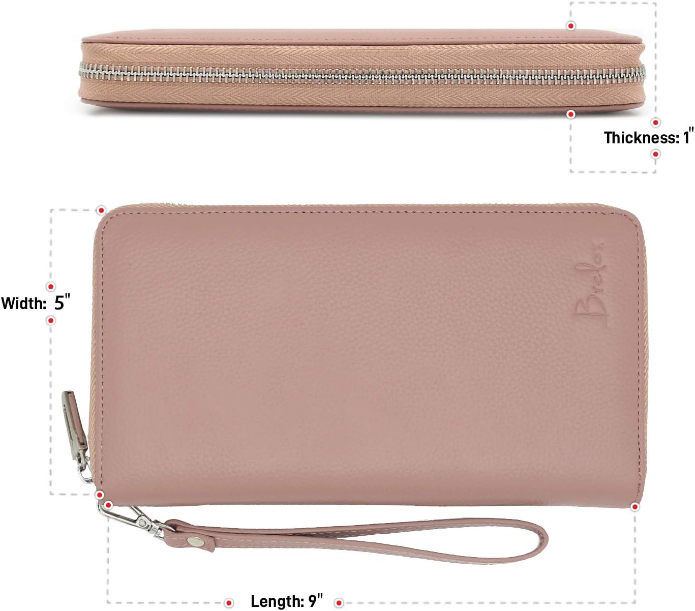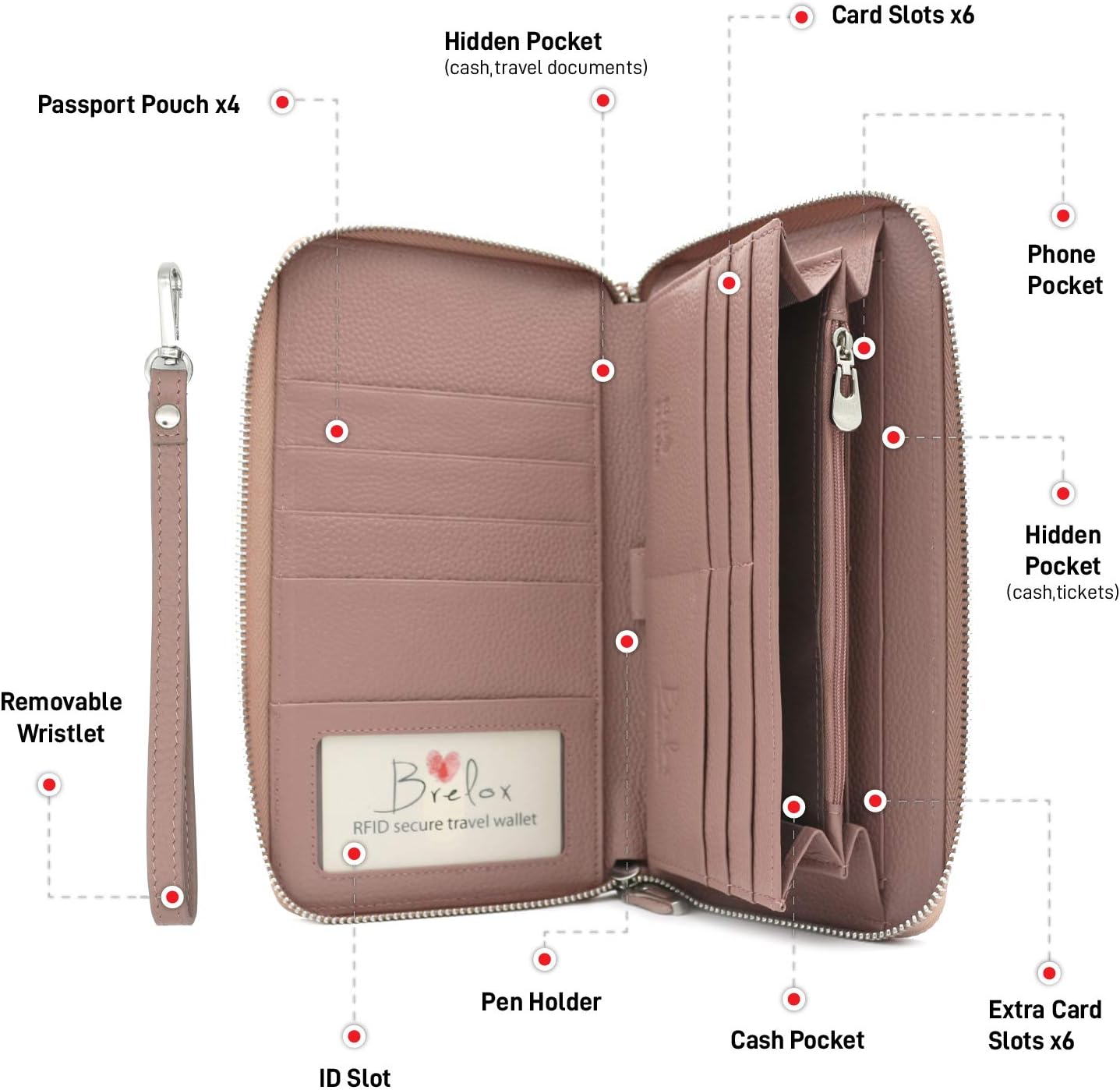 Introducing the Brelox Travel Wallet Family Passport Holder, a stylish and functional travel accessory designed to hold up to 4 passports and other important documents. Crafted from high-quality genuine leather, this RFID document organizer features a zipper closure and includes a variety of compartments and card slots for added organization. It has 12 card slots, 2 separate compartments for bills and phone, a large zip pocket, and an extra hidden pocket for cash and travel documents. The removable wristlet allows for easy handling during busy travel, sightseeing, and shopping. The wallet measures 9×4.5×0.5 inches and is available in Blush Pink color. The product is made by Brelox and it is perfect for women who love to travel. It is recommended to clean with a dry cloth.