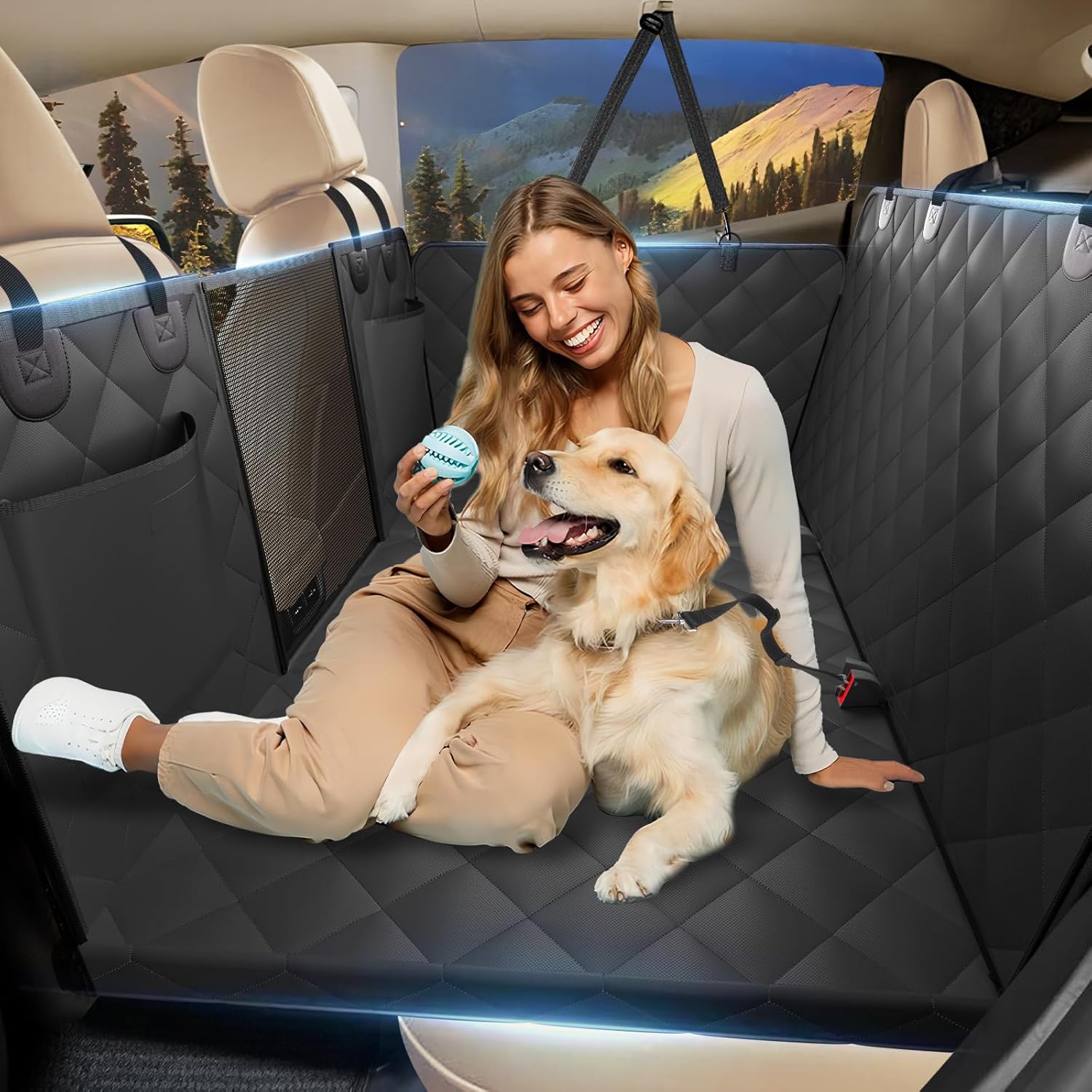 【Tested No Water Seepage, Easy to Clean, Protect Car Seat】Our backseat cover for dogs in car has been tested for its double-layer water resistance and absolutely does not seep. At the same time, the enclosed design of back seat extender for dogs keeps your back seat cleaner and protects it from your dog’s hair, saliva and paws. At the same time can be disassembled for machine washing, can also be cleaned with ordinary cleaning brush, very convenient.