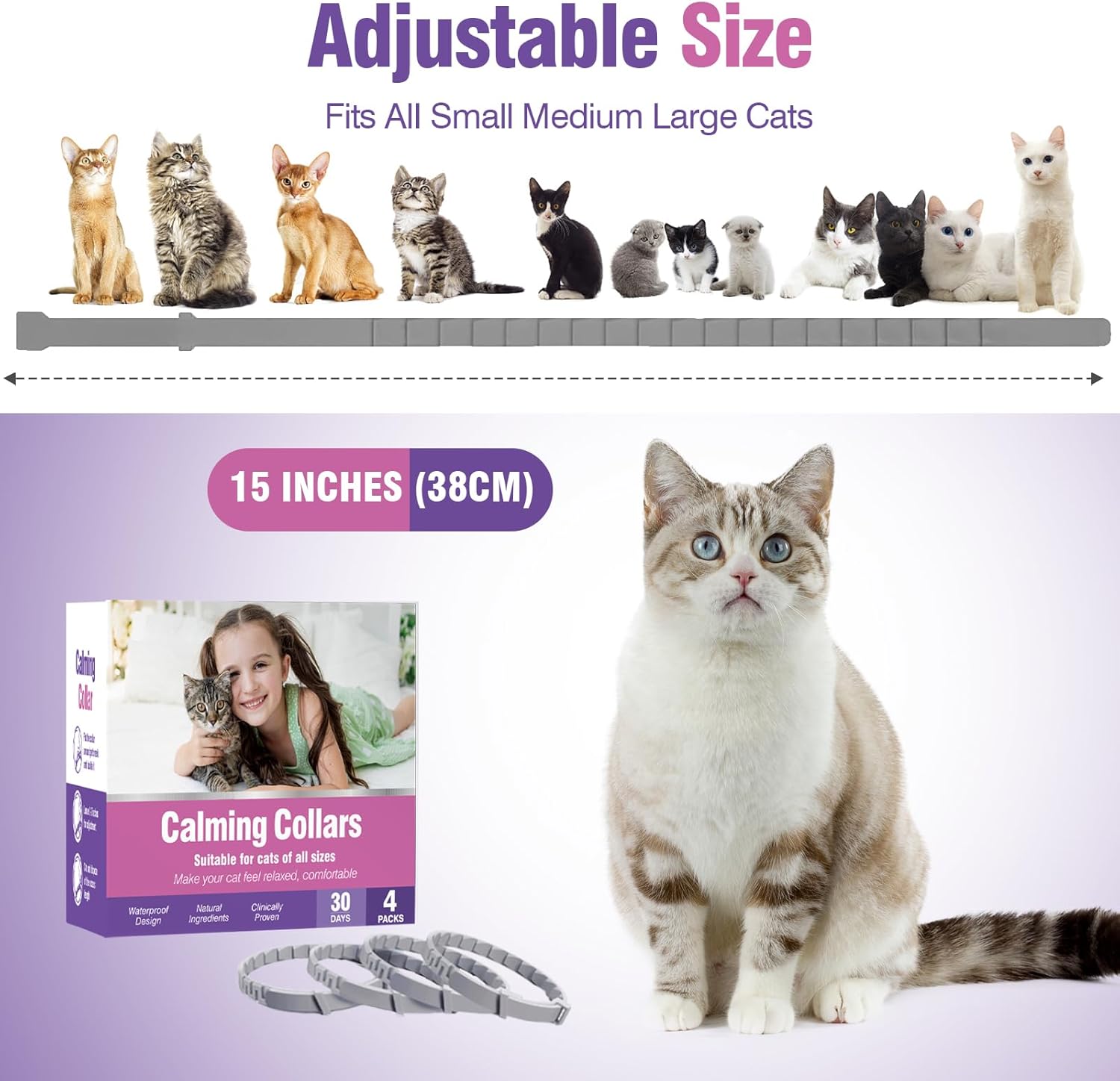 [Calm Lasts 30 Days] Calming collar for cats providing up to 30 days of sustained pheromone release,cats calming collar ensures high quality and longer-lasting pheromone delivery for your cat. For best results, cat calming collar can be worn continuously. Also, you don’t need to worry about taking the calming collar off in the shower or in the rain, because the calming collars for cats is waterproof, the calming cat collars will keep your pet relaxed even in wet conditions