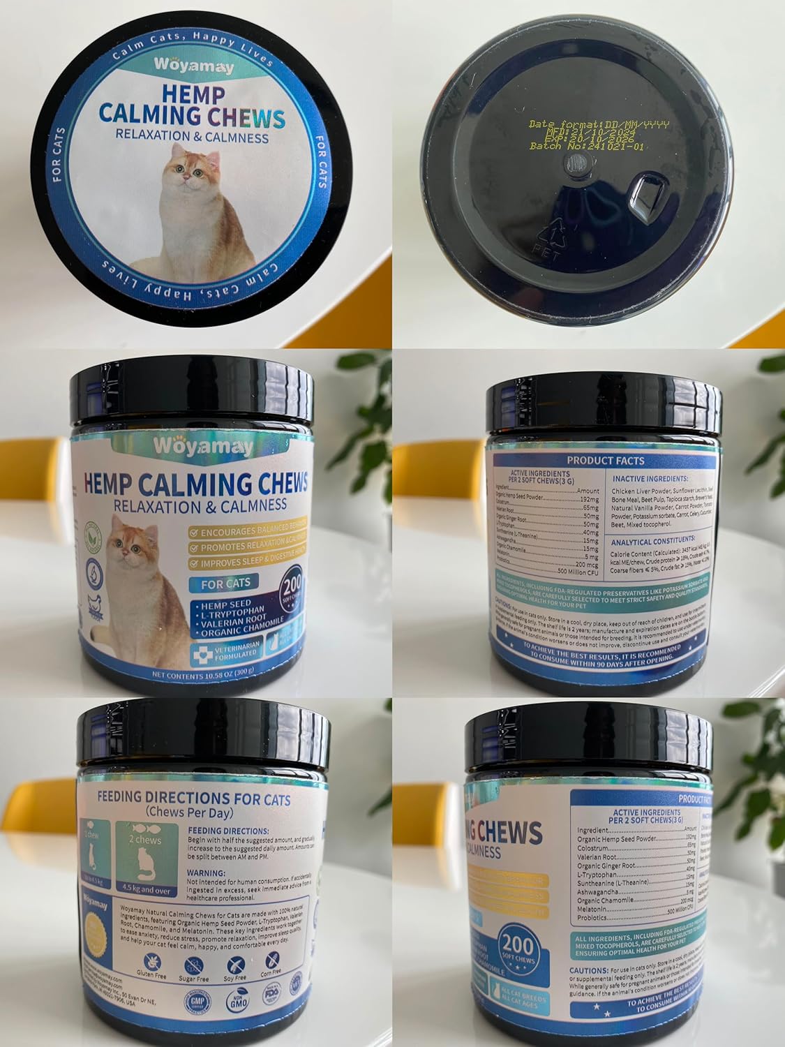 NATURAL AND SAFE CALMING SOLUTION: Woyamay hemp cat anxiety relief chews for cats are clinically researched and formulated by pet experts. Each soft chew contains natural calming support ingredients such as hemp seed oil, chamomile, valerian root, melatonin, and L-tryptophan. It is a natural cat calming product of all ages and breeds. A gentle yet effective, veterinarian-recommended calming care for cats.