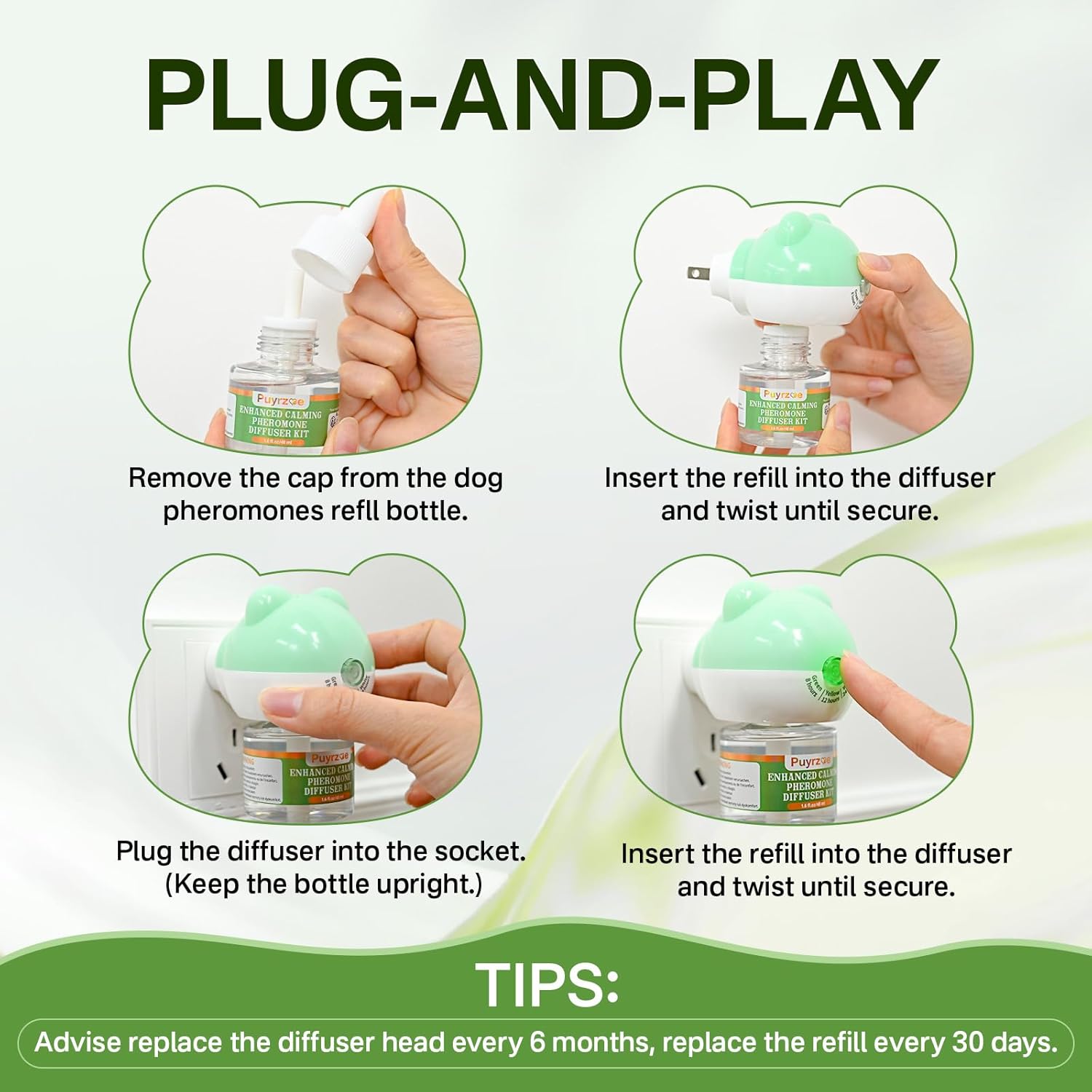 GENTLE STRESS RELIEF FOR DOGS: Puyrzoe dog calming diffuser releases a gentle, pheromone-inspired formula that helps ease common stress-related behaviors in dogs, such as excessive barking, biting, destructive chewing, urine marking, and tension. Whether it’s loud noises, thunderstorms, new environments, or vet visits, this dog anxiety relief diffuser helps your dog feel more at ease and improves household harmony.