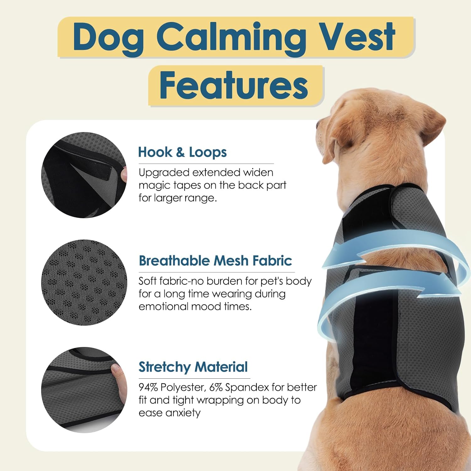 Soft & Breathable Mesh Materials: The dog calming vest is made of elastic mesh fabric, which allows continuous mild pressure, relieving stress as well as anxiety; the close-fitting wrap feeling tightly around the dog is just like the owner’s cuddles, which can keep the dog calm when you are out
