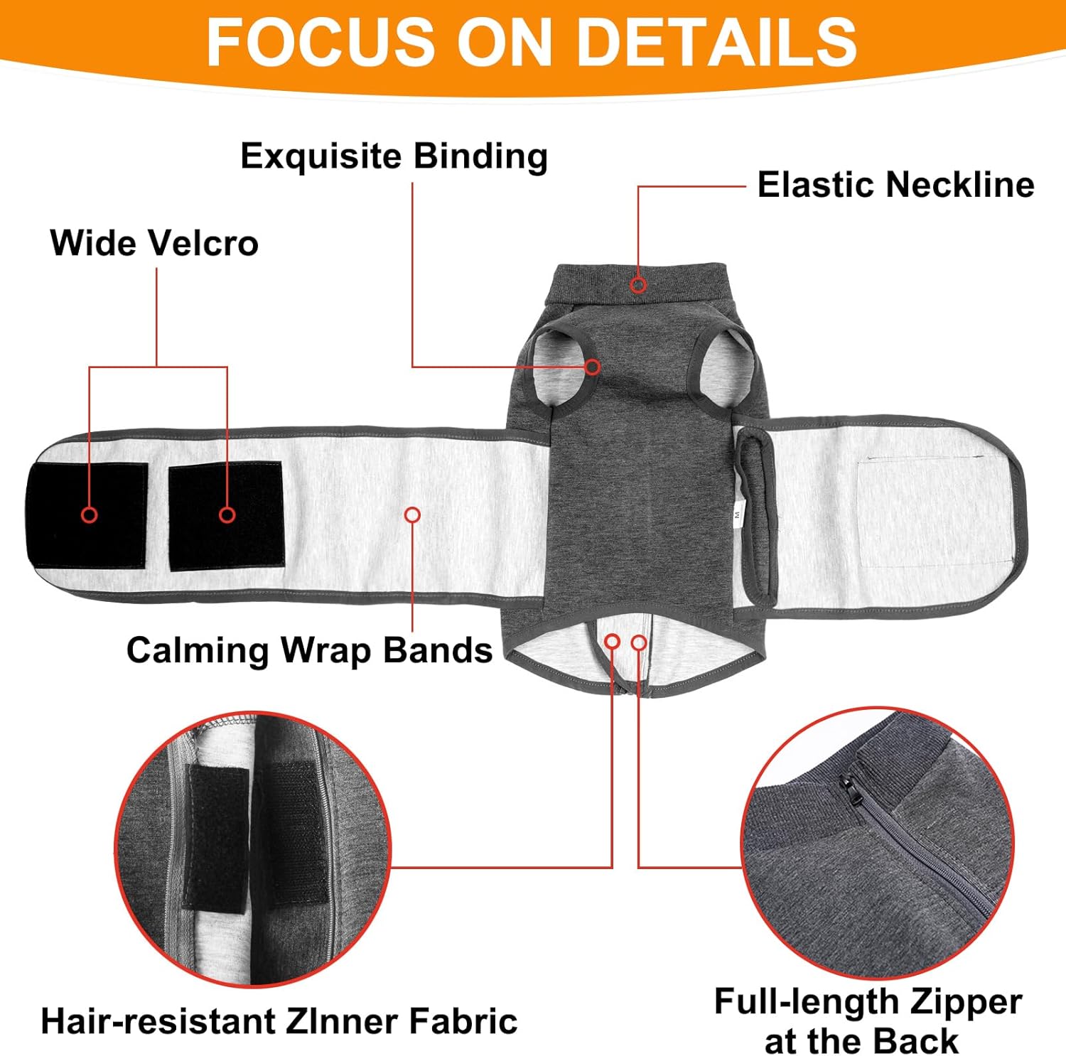 【UPGRADED HUMAN-CENTERED DESIGN】- This anxiety vest for dogs is fully expandable for effortless dressing. The back features a full-length zipper design, with an extra fabric layer inside to keep the dog’s hair from getting caught. The wide Velcro on the wrapped strap not only ensures the garment stays in place but also provides a custom fit for your dog, allowing you to adjust the tightness to match their body shape