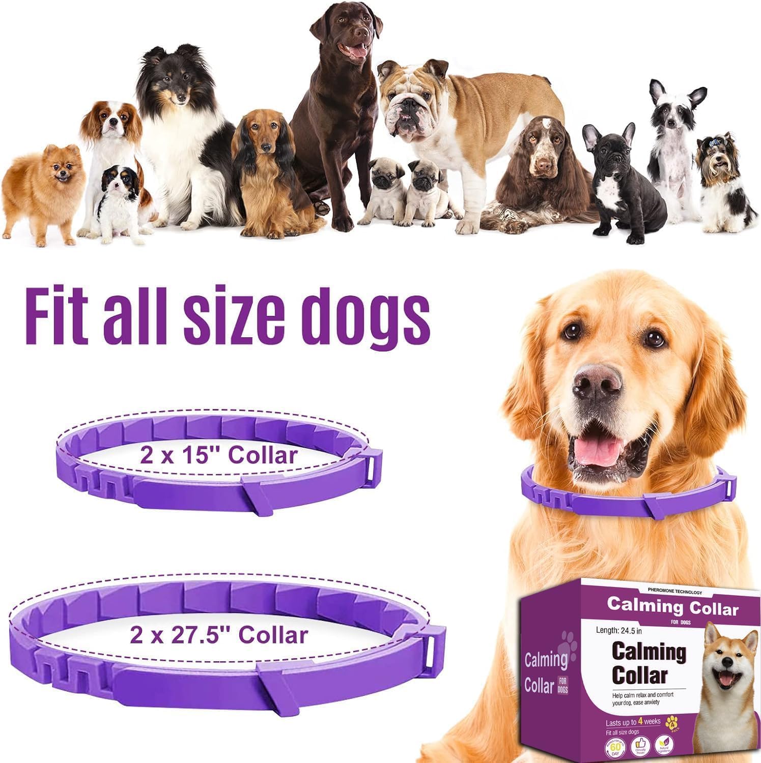 【Cost-Effective Dog Calming Collar】 This dog calming collar is designed to relieve anxiety in dogs. It instantly relieves anxiety and fear caused by noise, thunderstorms, veterinary visits, travel stress, or separation. Its pheromone-based formula effectively addresses separation anxiety, soothes emotions, promotes calmness in new environments, and helps curb undesirable behaviors such as excessive barking and destructive chewing.
