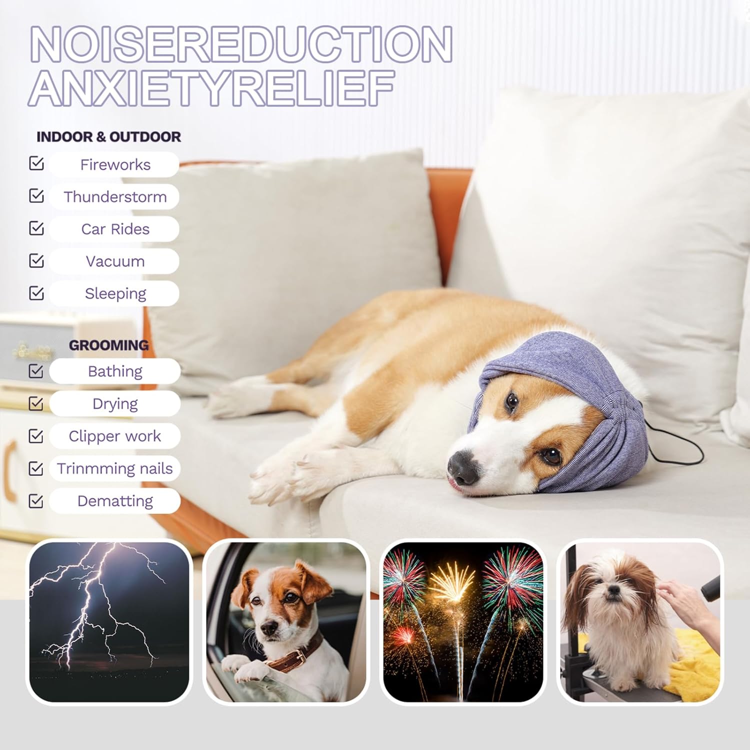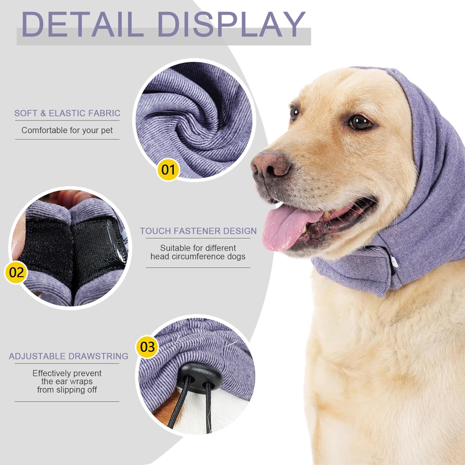 MULTIFUNCTIONAL DOG HEAD COVER: Anti-anxiety aid for stress in the home, car, and at the Vets; dog ear muffs for noise cancelling to protect dogs’ears and hearing from loud noise, such as Thunder, Fireworks, vacuums, and gun fire; aerate the ears; heal or prevent hematomas; neck and ear warmers; grooming aid; keeping long ear and facial hair up and out of the way while eating or drinking