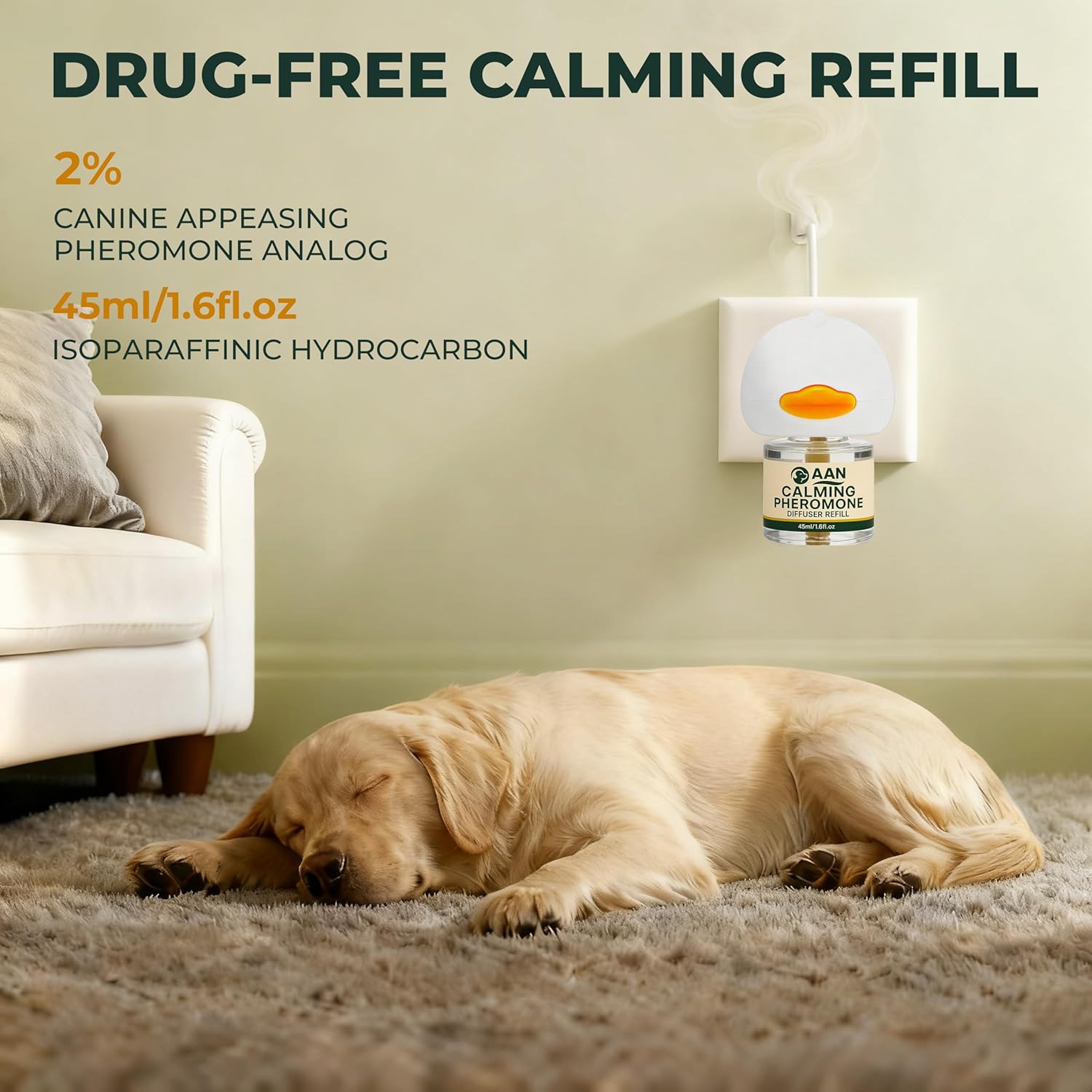 Covers Large Areas – Up to 700 sq ft – Designed to spread soothing pheromones effectively throughout rooms up to 700 sq ft. Perfect for multi-pet households or spaces where your dog spends the most time.
