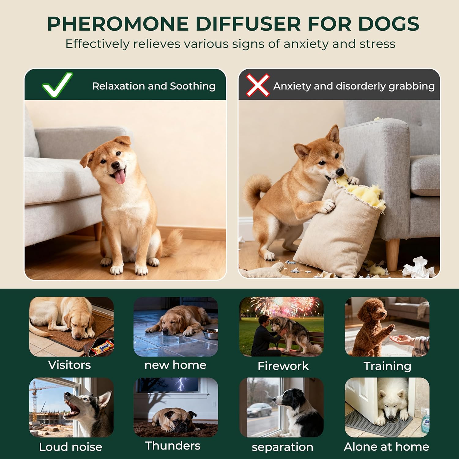 Relieves Stress & Anxiety – This pheromone diffuser helps dogs feel calm during stressful moments like fireworks, thunderstorms, vet visits, travel, or being left alone. It reduces barking, whining, scratching, and destructive behavior.