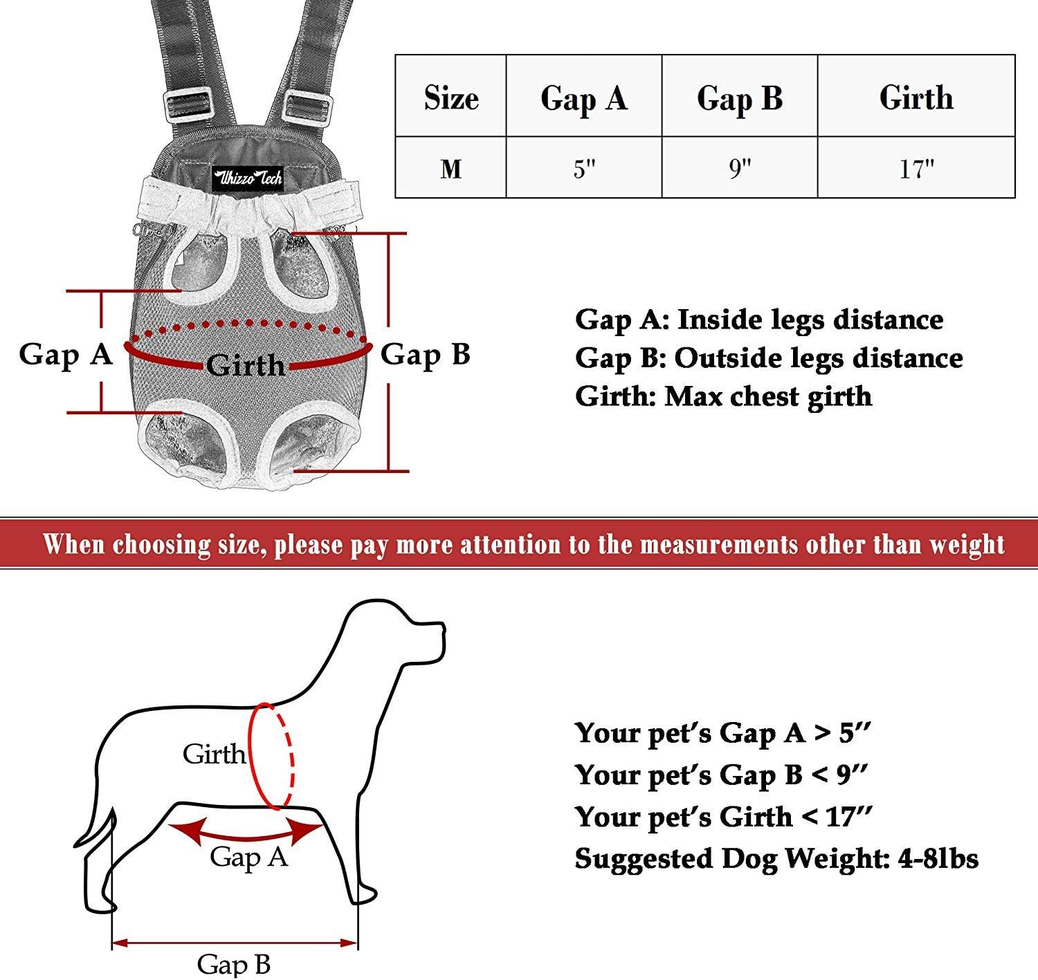 Total length 13″, Chest Circumference 17″, Width (left leg to right leg) 2″, Long (Front leg to Rear leg)9″, suitability 4-8lbs