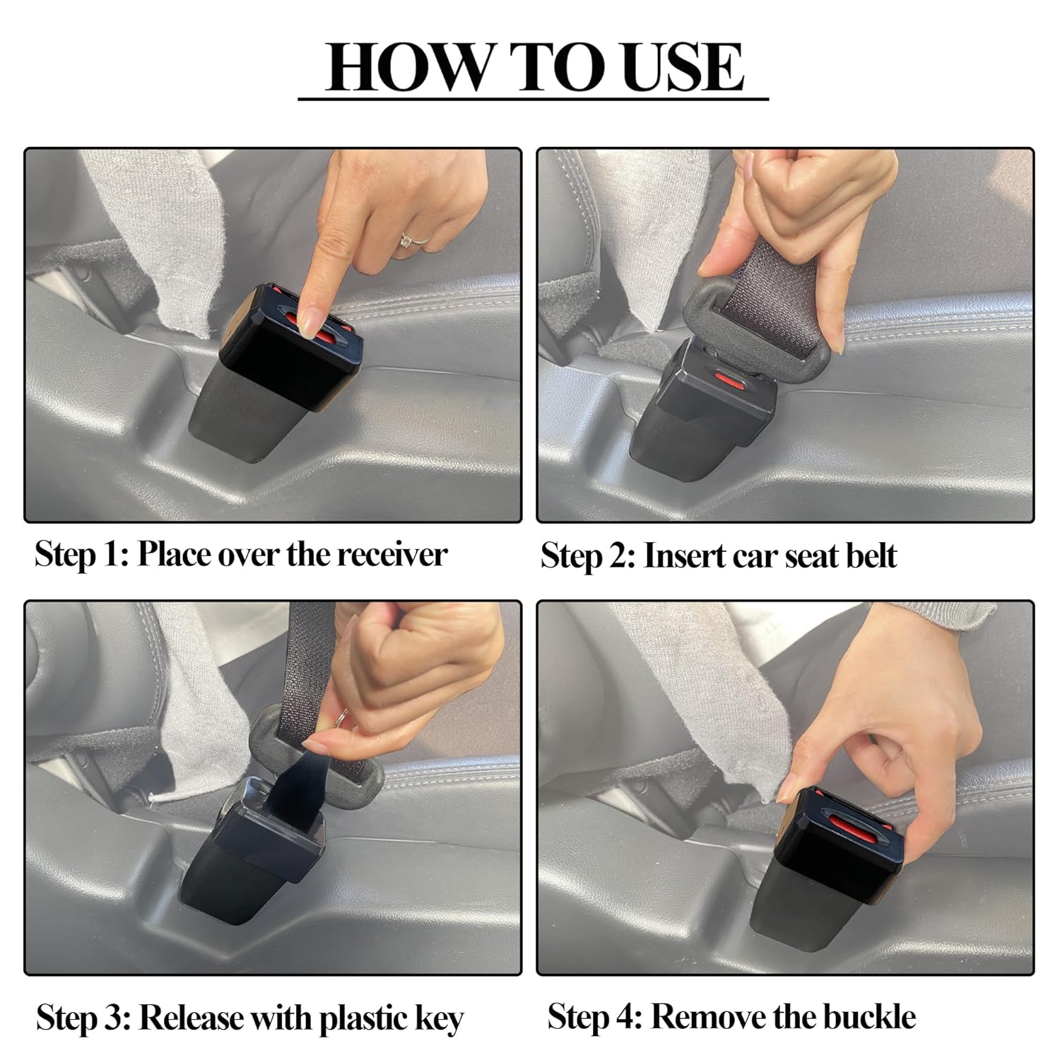 [Easy to Use]: Without needing any tools! Put the seat belt buckle guard over the buckle receiver and buckle the belt through the slot. To remove it, simply push the buckle release with a key.