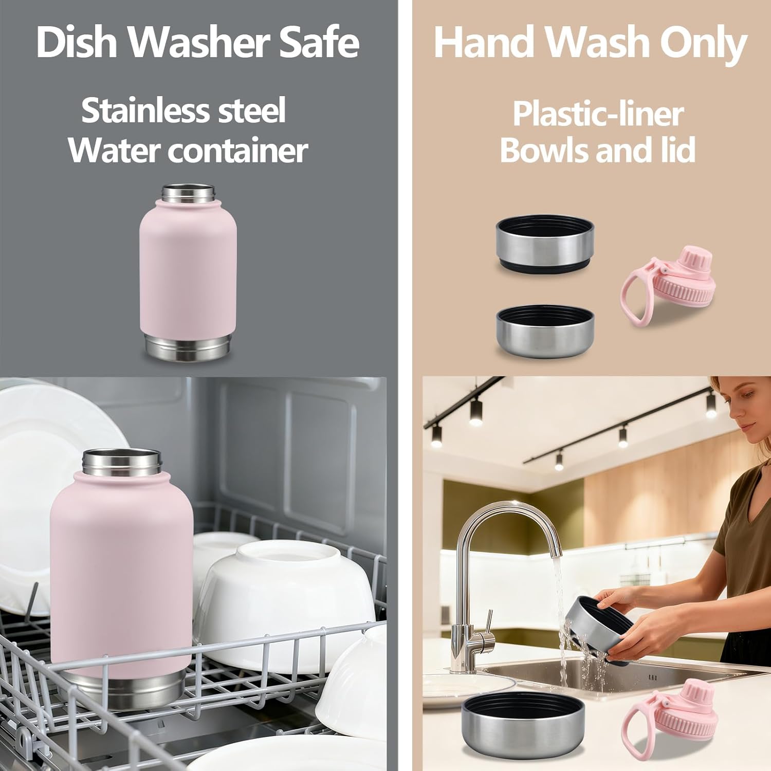 Hand Wash Only: Do not use the bottle for boiling water, and do not clean it in a dishwasher. This is because the lid and the bowls’ liners are made of PP; exposing them to high temperatures (from boiling water or dishwashers) may cause deformation or damage.