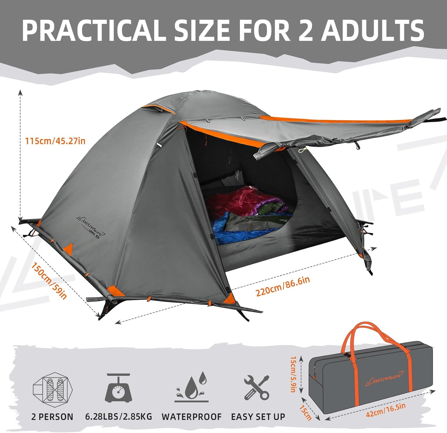 4 SEASON TENT: We offer a limited ONE-YEAR GUARANTEE. Polyester rain fly, groundsheet, and bathtub with PU 5000 coating are firmer than you expected. Weatherproof material with factory-sealed seams keeps you dry and comfortable in four seasons or cold weather! Better material but more affordable! You really need an appropriate lightweight 2-person tent for backpacking for ALL SEASON!
