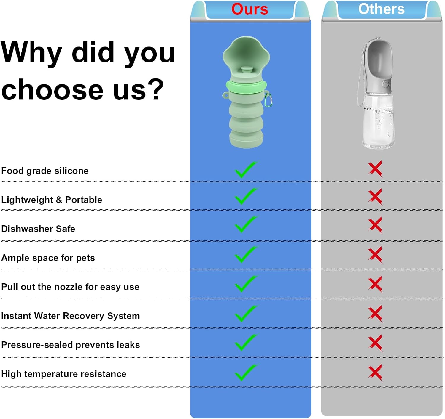 🐾 Vet-Approved Safety Promise:The foldable silicone dog water bottle is made of food grade silicone material, which is easy to clean. 78% cleaner than plastic bottles in laboratory testing. Dog water bottle with rounded corners to protect delicate mouth