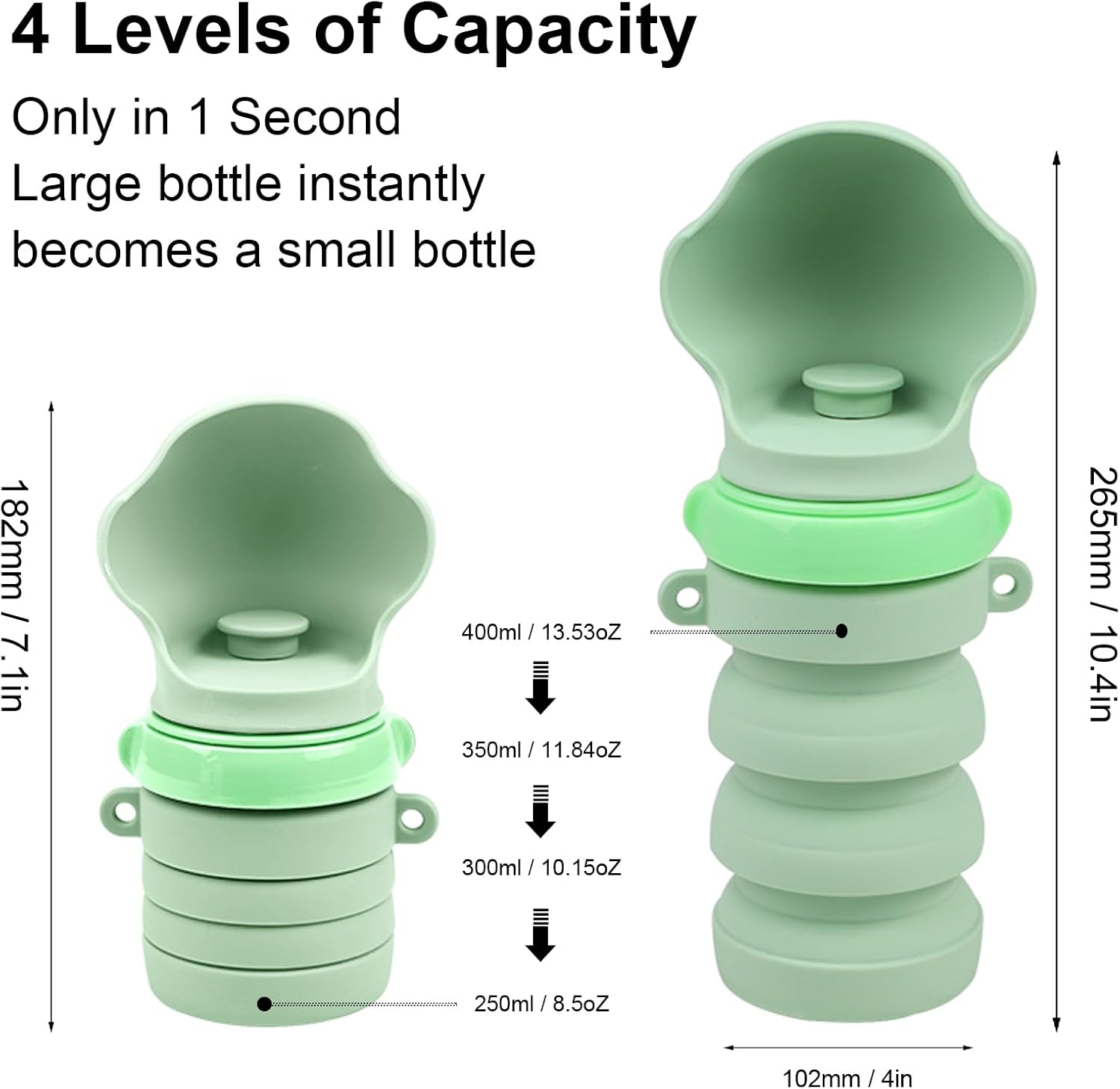 🚀 Space-Saving Collapsible Design:The dog water bottles transform from 14oz adventure-ready reservoir to 8.5oz compact pod with our accordion-style silicone body. Perfect water bottles for backpack pockets or car cup holders, this collapsible wonder eliminates bulky gear struggles during hiking/camping trips