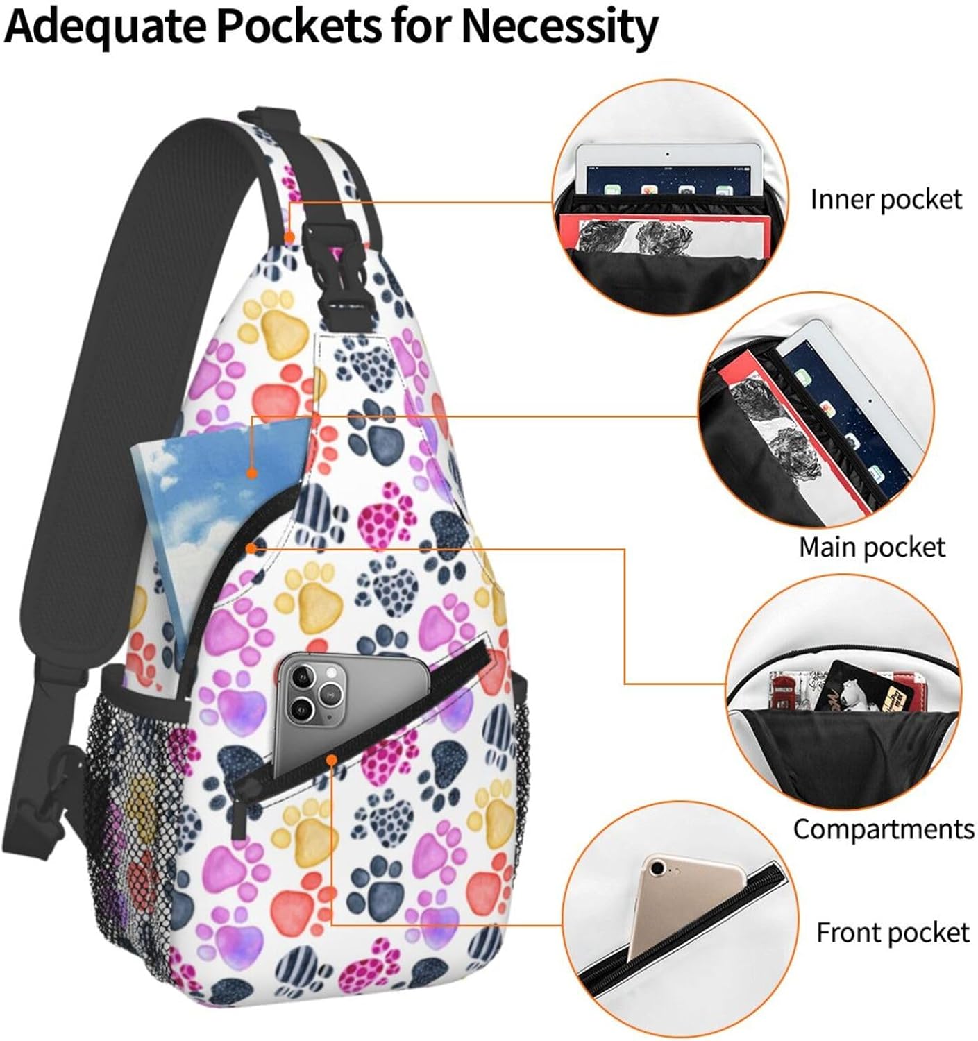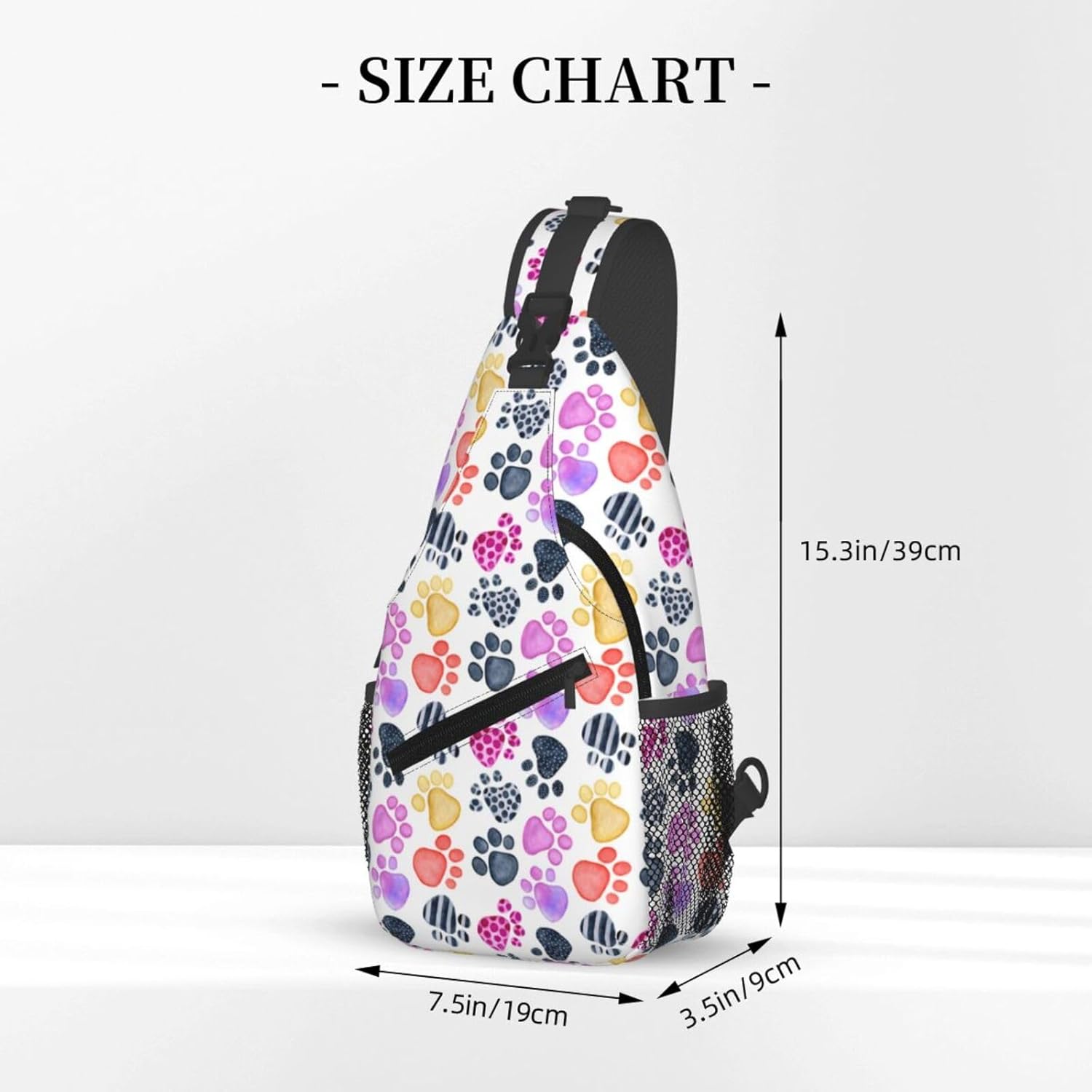 Quality Material: Polyester fabric; The colored dog paw print sling bag is soft, lightweight and washable; Adjustable padded shoulder strap can effectively relieve the stress of your shoulder and free your hands; Very convenient and practical to use, easy to clean
