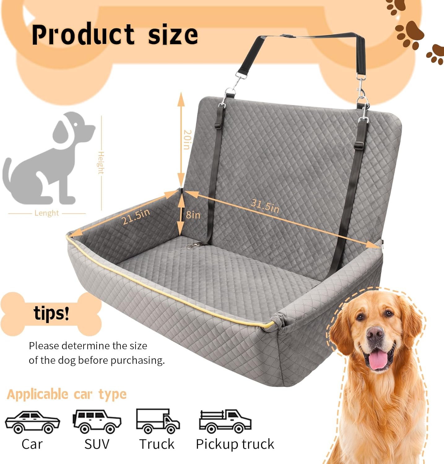 【Dog car seat bed size】Product size: Length 31.5 inches x Width 20 inches x Height 21.5 inches ; dog car bed is suitable for medium to large dogs weighing under 60 pounds or 2 small dogs under 25 pounds;Suitable for various vehicle models such as SUV, MPV, RV, etc.