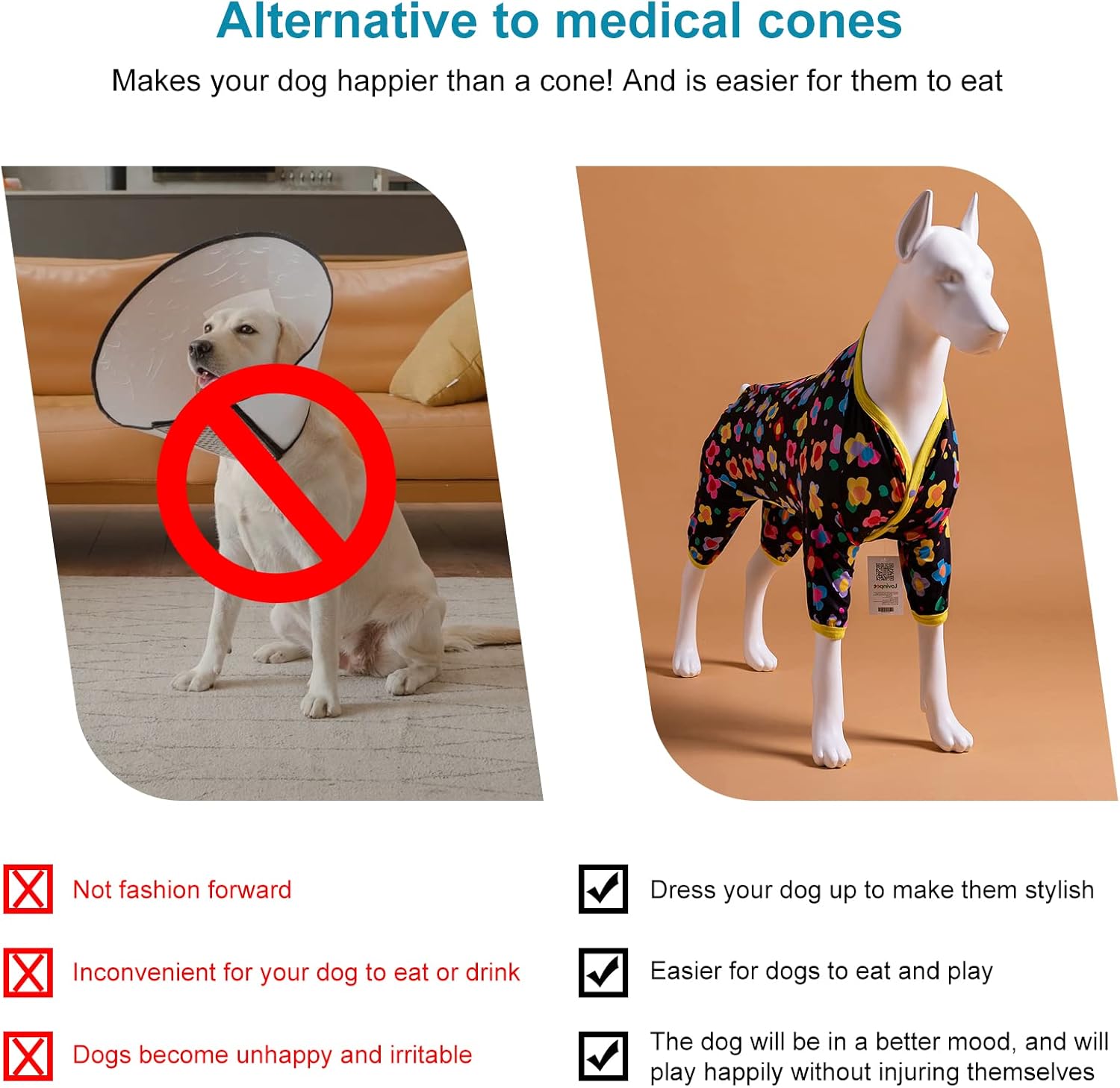 【Perfect combination of shame cones】If your big dog had knee surgery and this item is perfect. It is a great option to use instead of the dreaded cone of shame. It fits very well, and covers her knee perfectly. And, of course she is cute, adorable and comfortable.