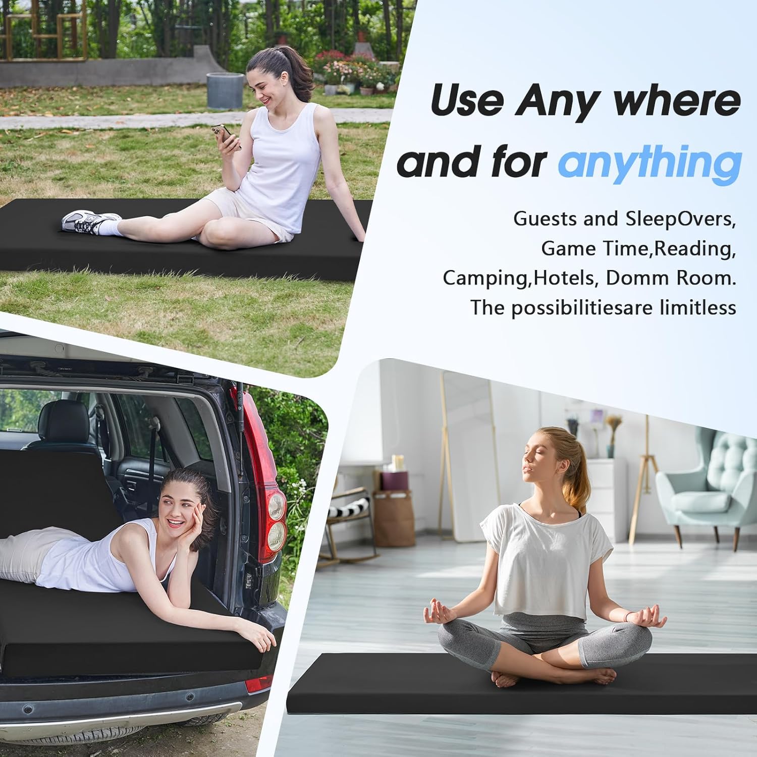 SUPER COMFORTABLE AND SOFT: The camping mattress is made of carbon fiber high elasticity memory foam, which can effectively relieve muscle pain and provide comfortable sleeping space, carbon fiber can absorb the odor of the sponge, and high-density support sponge is suitable for all kinds of hard floors. Breathable and comfortable fabric cover is suitable for all seasons, allowing you to get full rest.