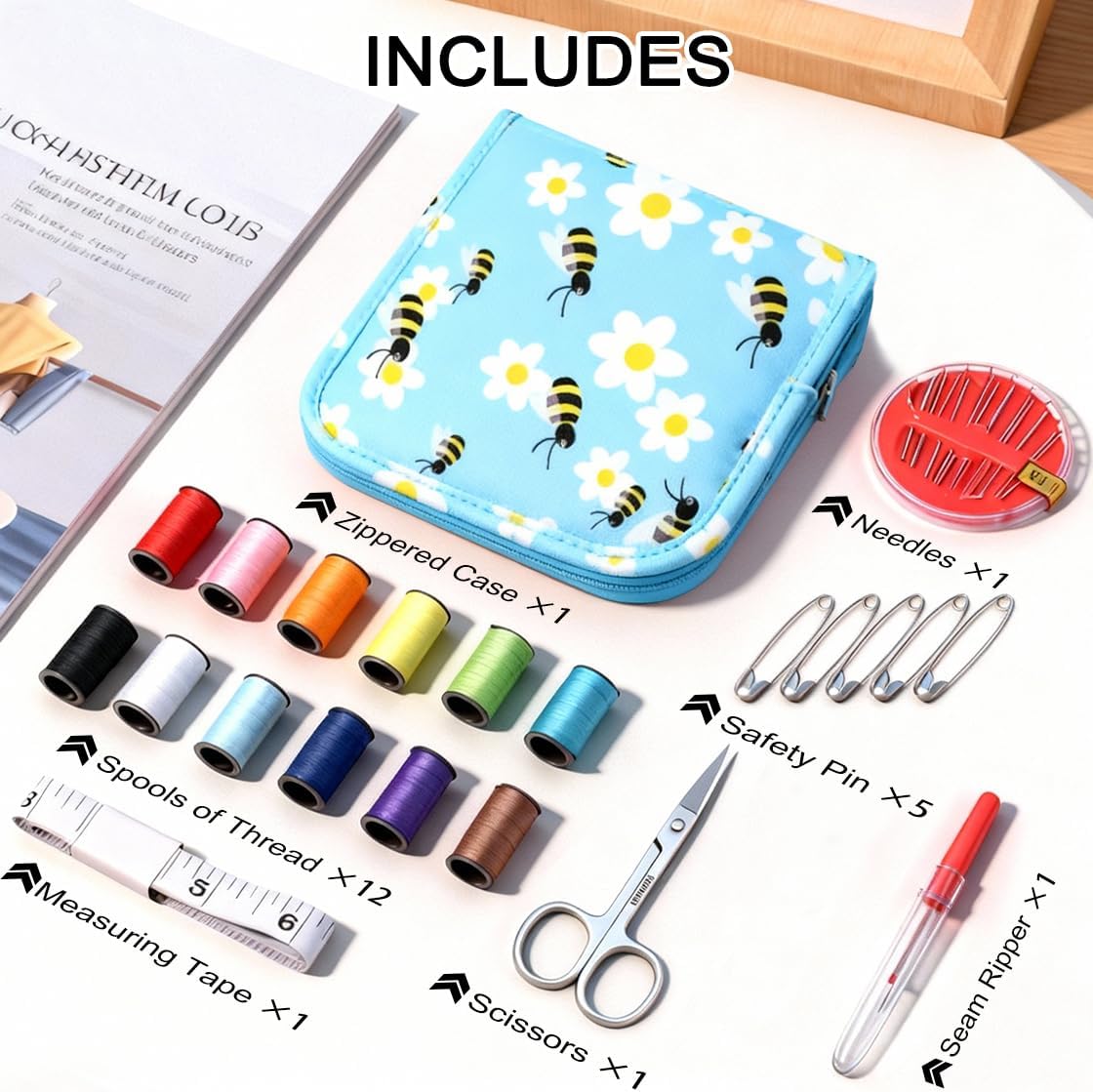 ALL-IN-ONE SEWING KIT: Includes 12 durable polyester threads, stainless steel needle case, seam ripper, safety pins, mini scissors, and tape measure. Everything you need for various mending tasks.
