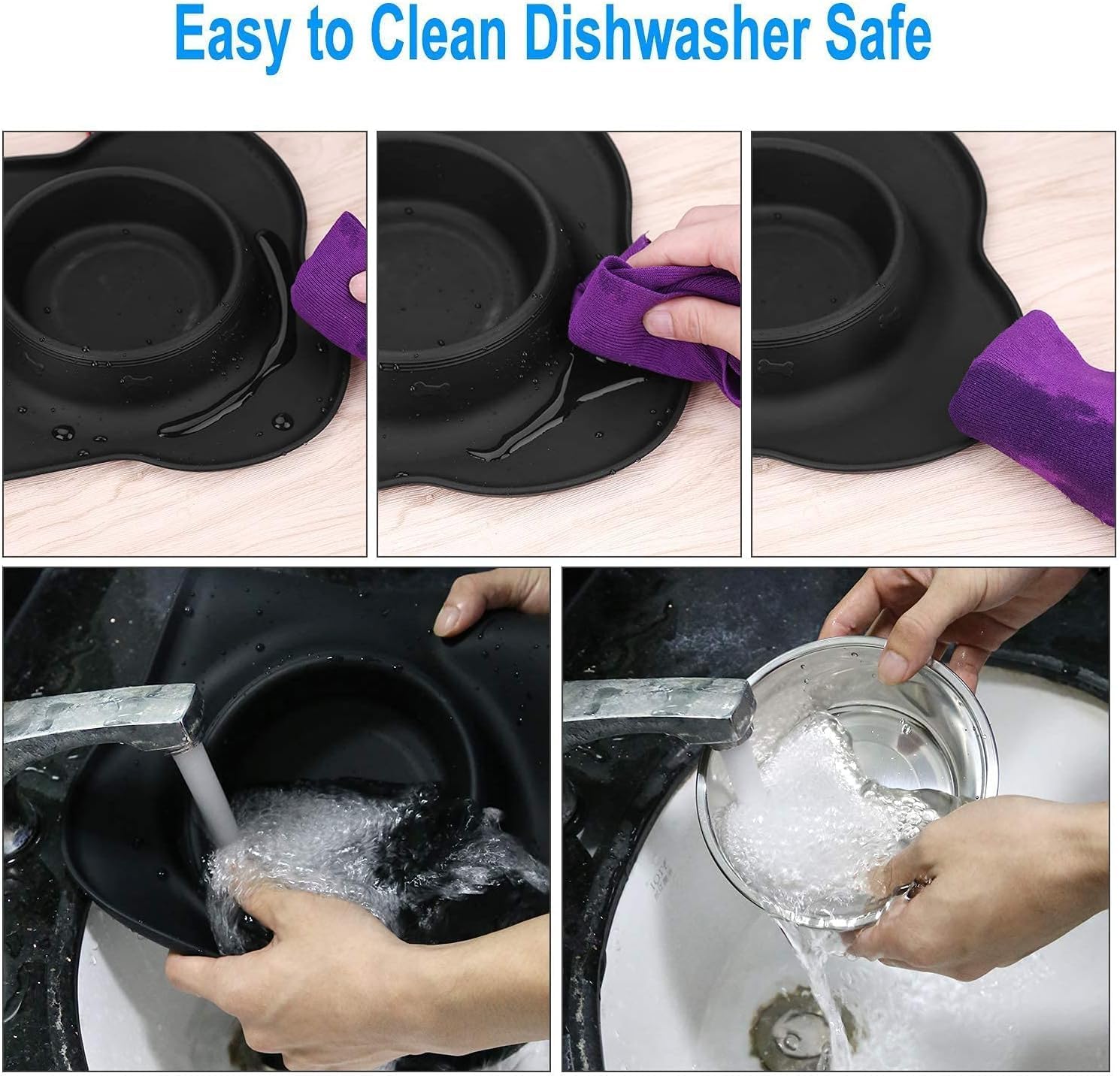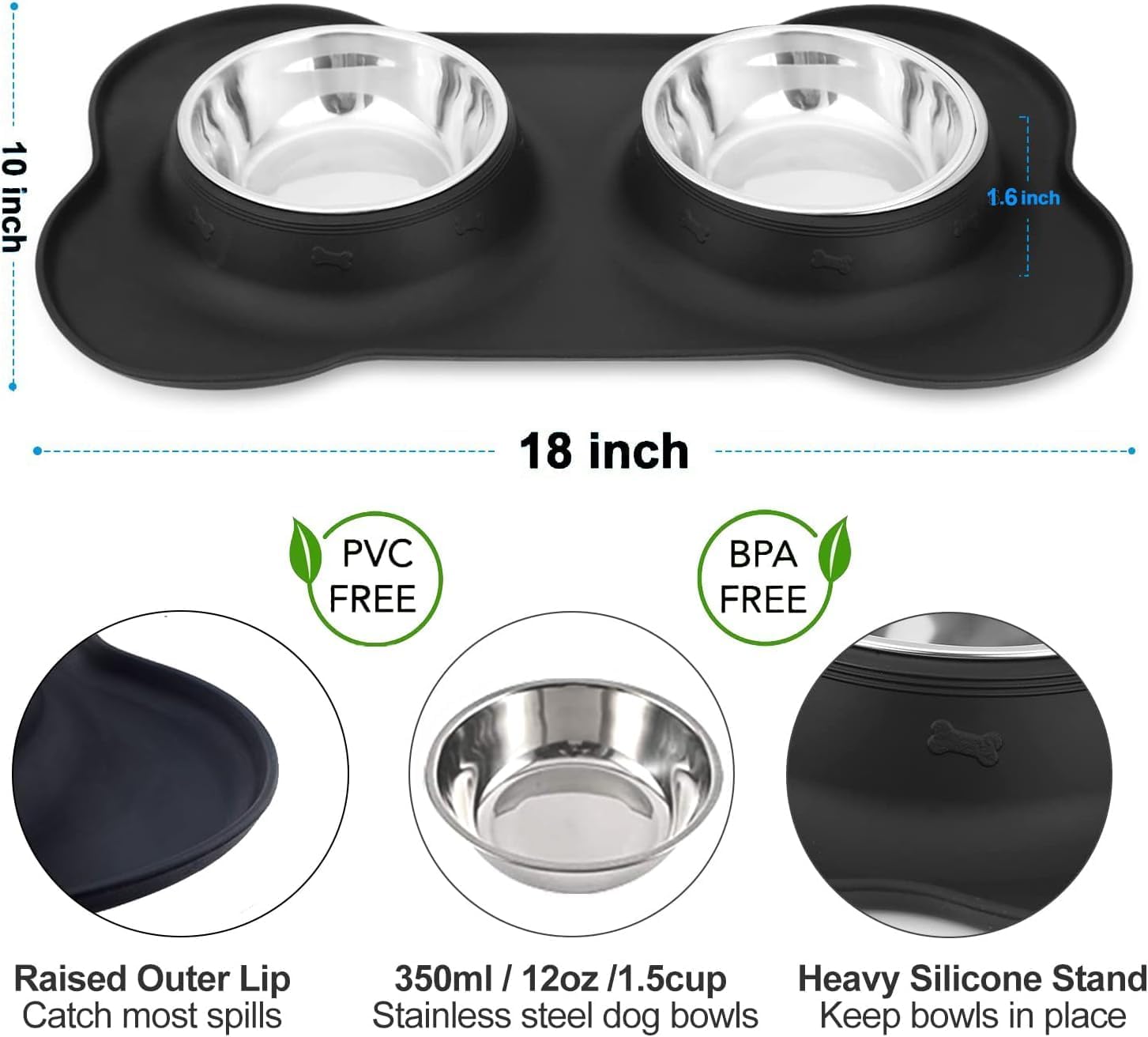 Lightweight & Versatile & Well designed doggie bowls: The sturdy rubber mat holds the bowls in place and doesn’t slide on the floor – it keeps everything in place. Good for keeping bowls stationary.No More Mess On The Floor: The silicone mat keeps the bowls secure and rubber dog bowl holder shaped like bone has a nice raised edge so anything that puppy drops around the bowl stays by the bowl. This food bowl can save you from having to pick up lots of food off the floor.Safe Material & Super easy to clean: Entire thing is dishwasher safe so I can sanitize it between dogs’ visits and it folds up and stores easily. The stainless steel bowls are a great alternative to plastic, and very durable.USD Widely: This pet feeder bowls are made of high-quality stainless steel with no-skid and spill resistance silicone mat, designed for puppies, small dogs, cats, or kittens, medium dogs.