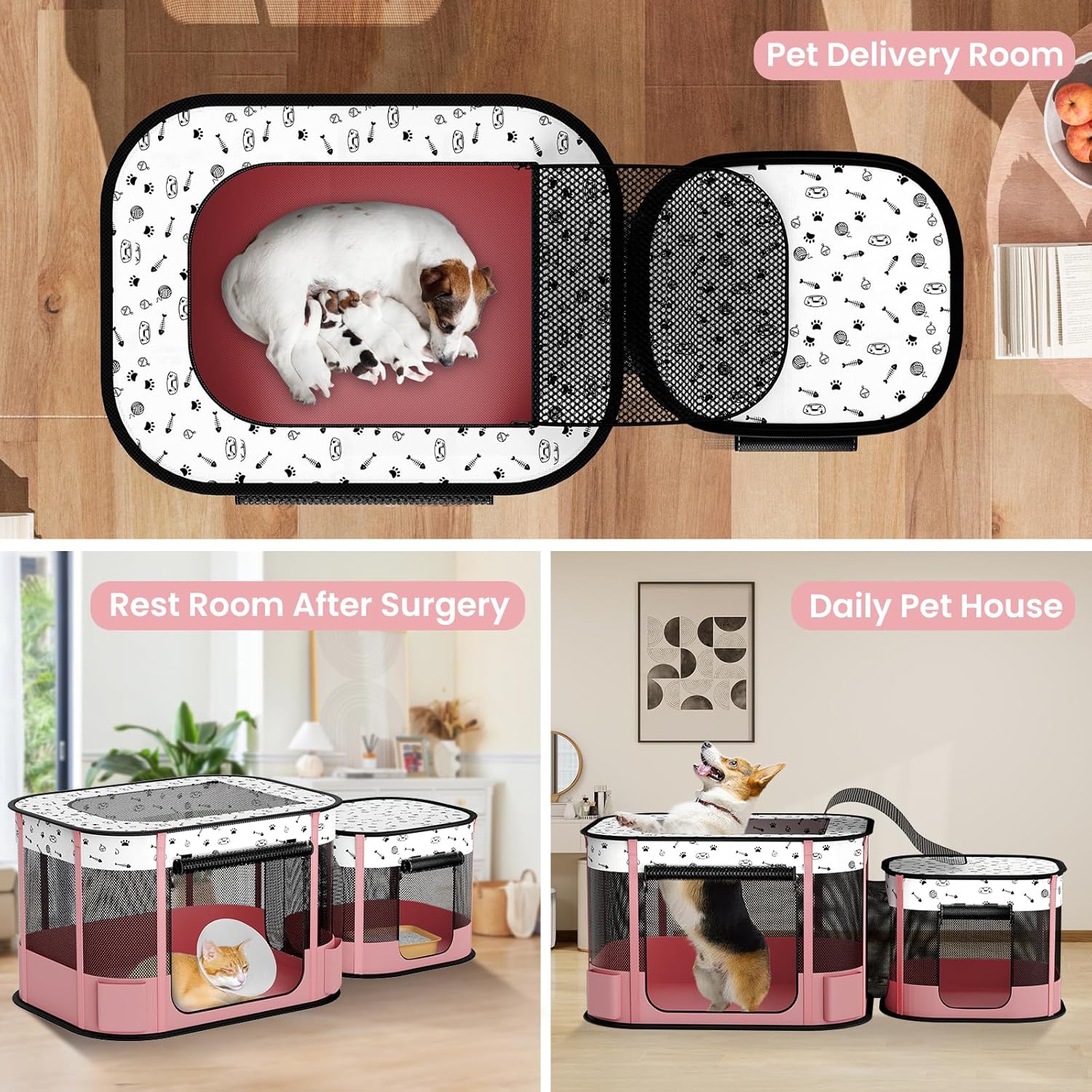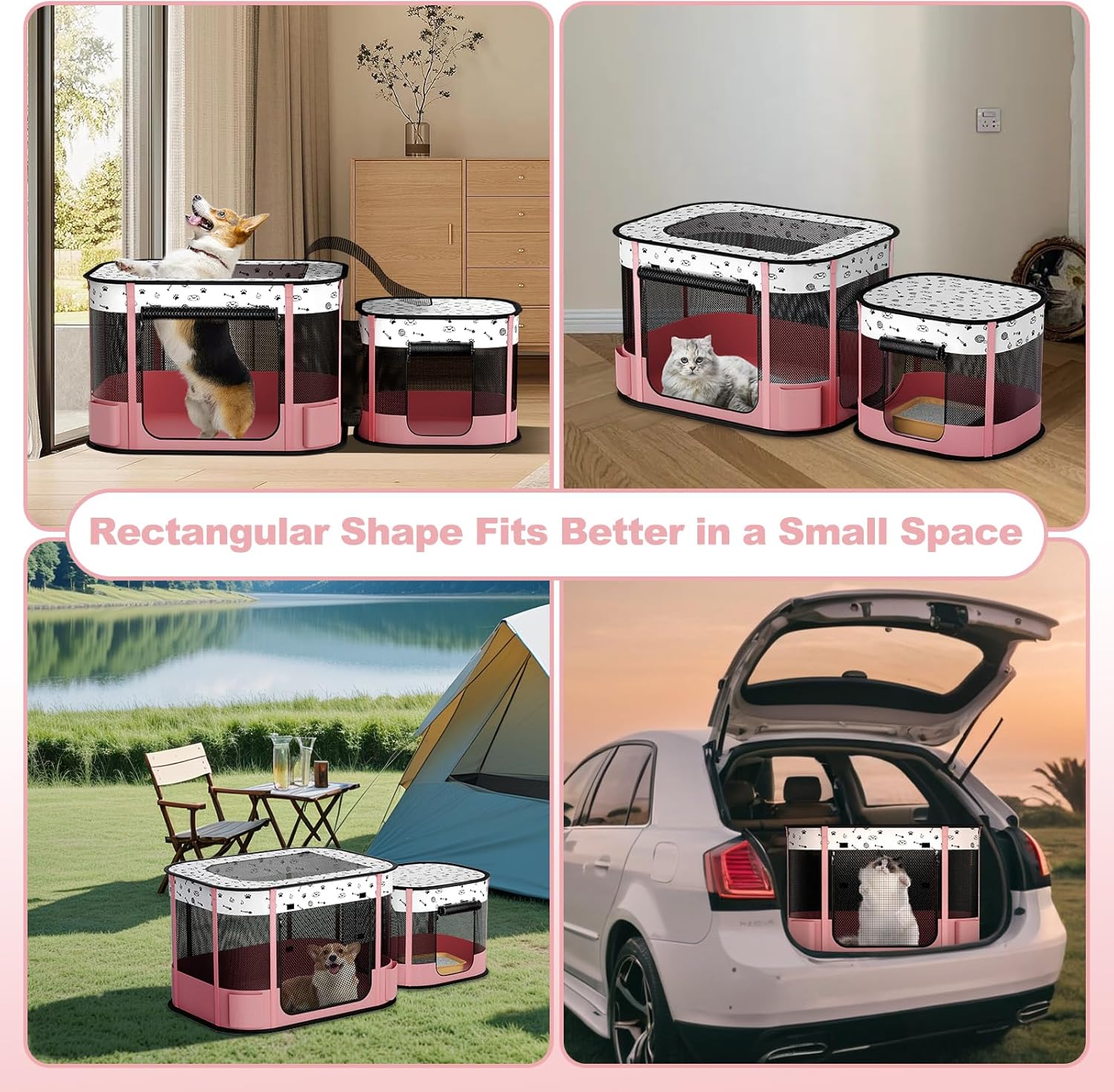 SUITABLE DIMENSIONS: Big Playpen: 32″L x 24″ W x 22 “H and Small Playpen: 22.5″L x 18” W x 18 “H, Please measure your pet’s size. This is recommended for cats and small-sized dog breeds. It can be used for rabbits, too. This is the one we should use to keep our pets more clean by separating spaces so as to support general health for them