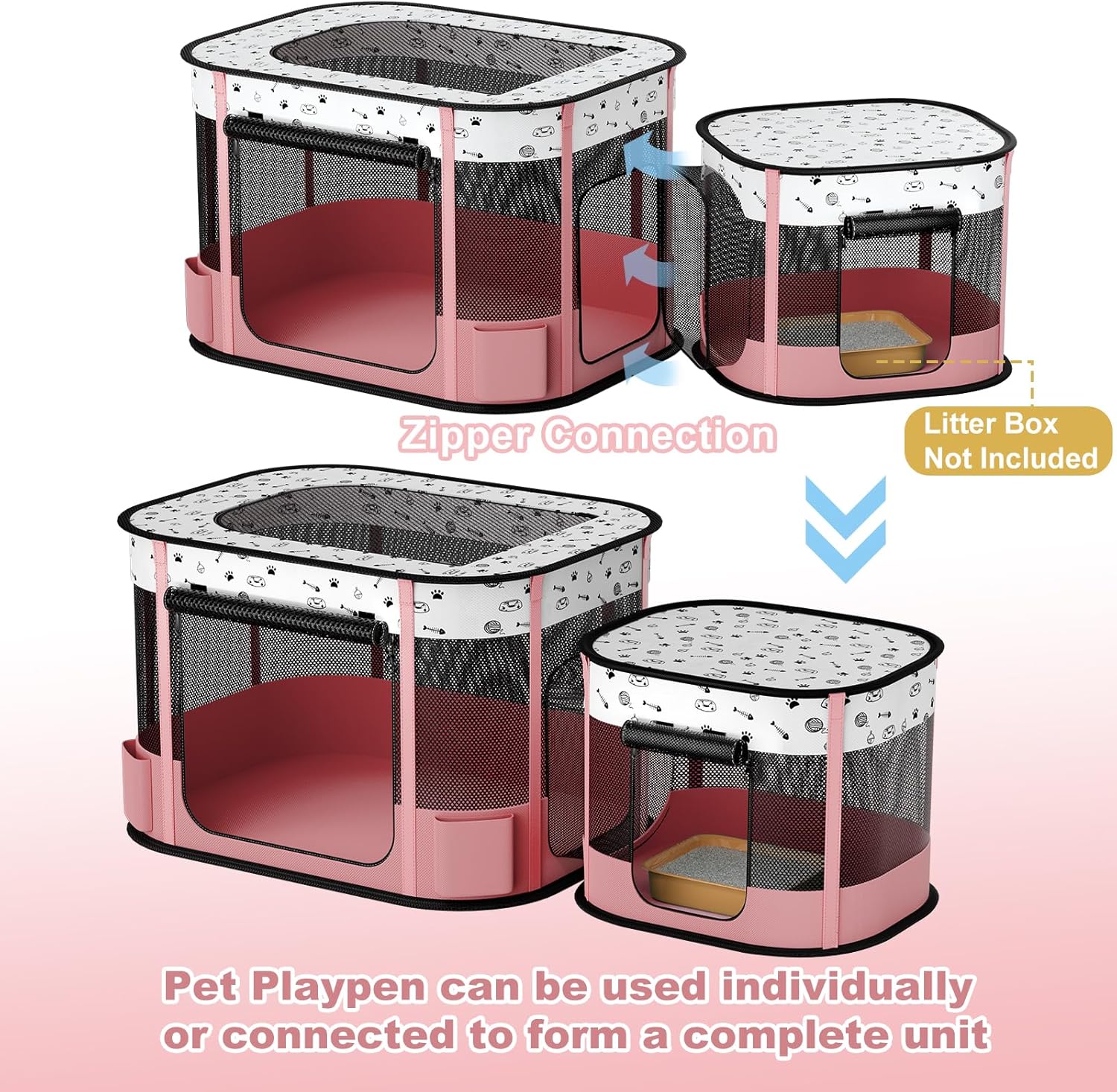 DETACHABLE CONJOINED CAGE: Separate the cat litter area from the cage, keeping away the odor of the cat litter. These two cages can also be used independently, offering a larger indoor play area. It has a door for both large and small playpen