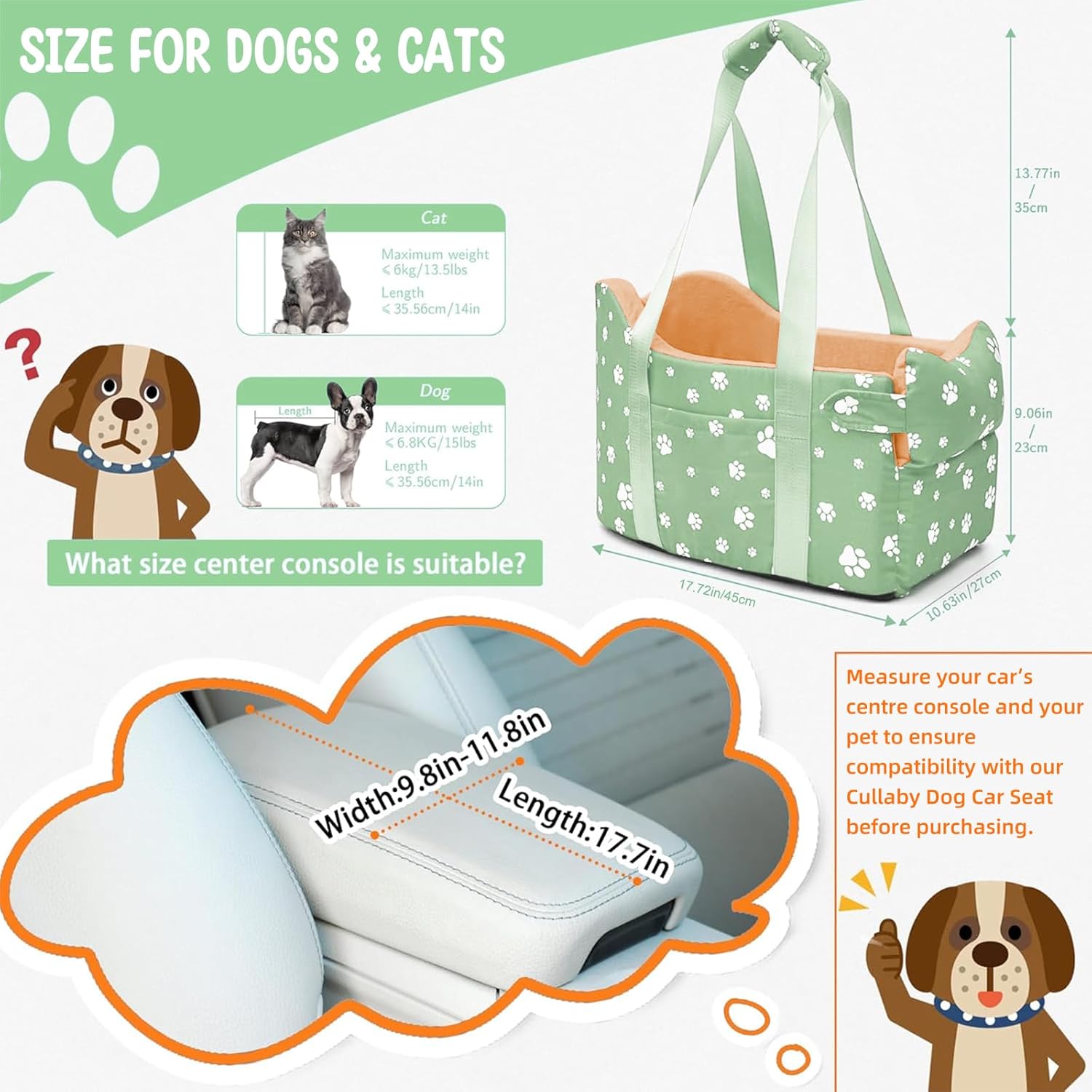 Perfect Fit Pet Car Seat – For Small Dogs & Cats The Cullaby Pet Car Seat is designed for pets with a back length under 14 inches (35.56 cm) and a weight under 15 lbs (6.8 kg). It fits most cars, SUVs, and wagons without taking up extra space. Measure your pet’s length and console size before purchasing for the best fit.