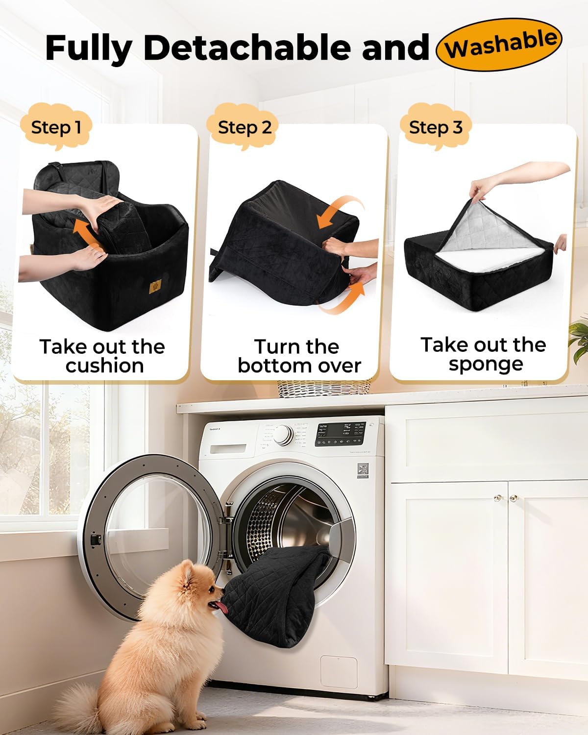 Multi-scenario Use: Perfect for car rides and more, small dog car seat serves as a cozy dog bed or sofa for sleep rest in home bedrooms, living rooms, outdoor spaces, camping trips, or anywhere your paw doggy needs a comfortable place to rest. Two large storage pockets on dog car booster seat sides keep your dog’s food, toys, and supplies close by.