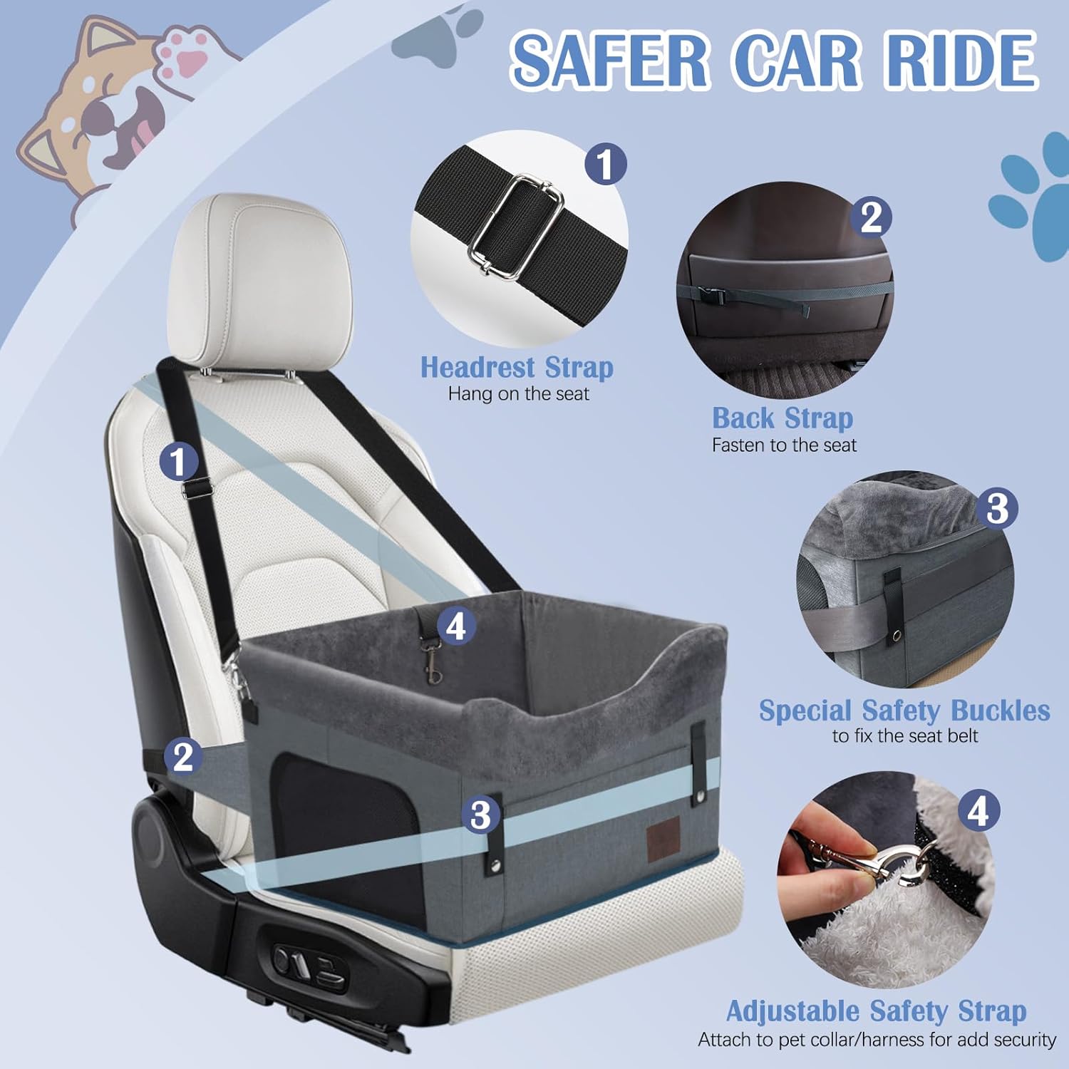 Easy to Install & Triple Fixation: Our dog booster seat is easy to install: hang the adjustable strap and fasten the back strap, then fixed seat belt. Triple fixation make sure the dog car seat stay securely in place during drives, plus an adjustable clip-on safety leash, preventing pet from jumping out and keeping your pet safe while driving