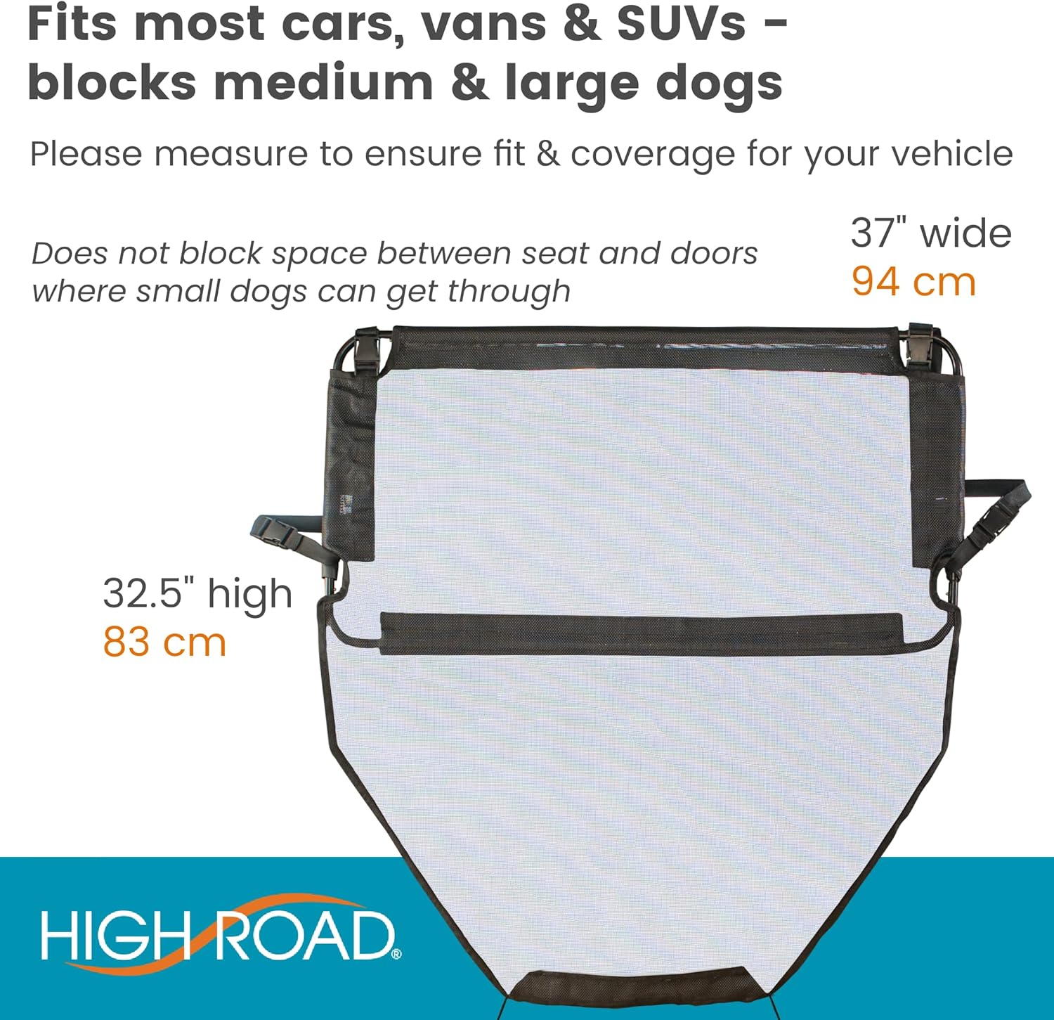 High Road’s Dog Barrier fits snug to seatbacks & measures 37″ wide & 33″ high to help keep medium & larger dogs safely in the back
