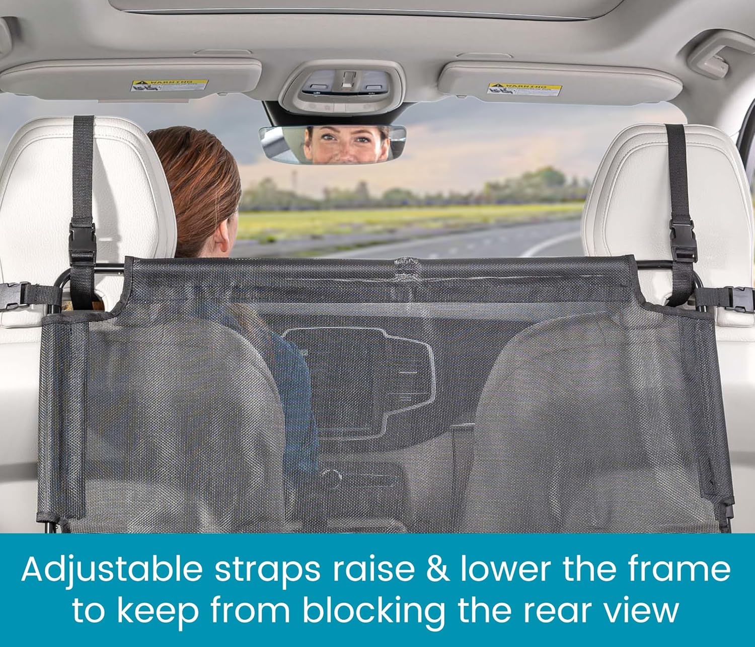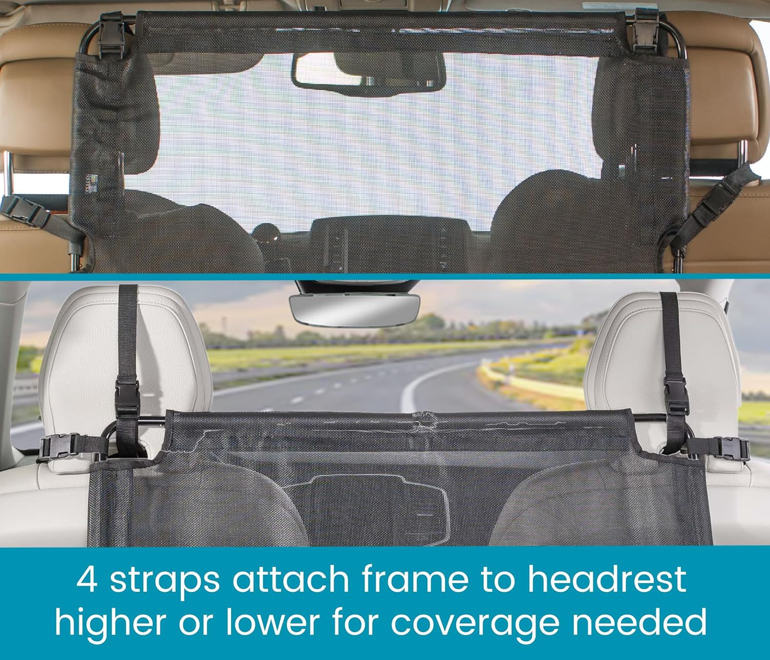 Adjustable Height Keeps from Blocking the Rear View – can be positioned at the top of the headrest in trucks and SUVs or lower and level with the seat back in compact cars and sedans to keep the rear mirror view unobstructed – includes 4 adjustable straps to attach whichever way works best for your vehicle, with a bottom cord that attaches to the seat base for secure coverage and stability