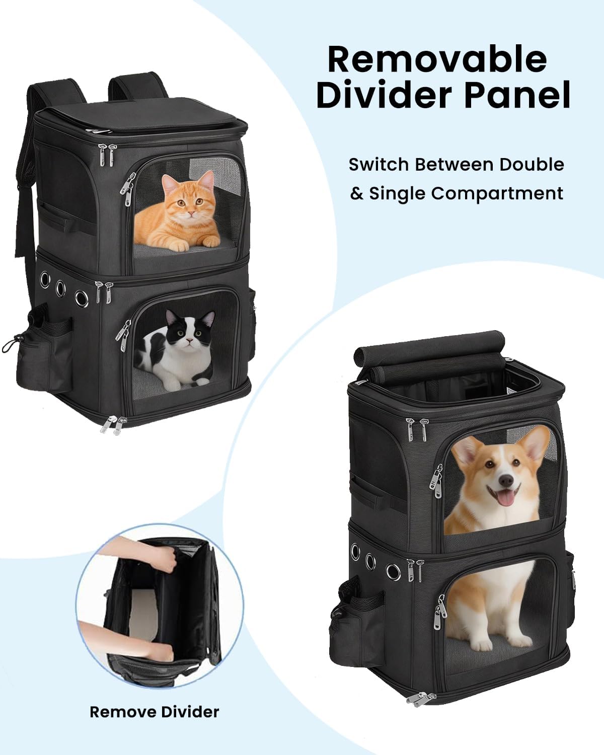 【Measure Before Purchase — Fit Matters More Than Weight】:This 2-layer cat carrier backpack is suitable for 2 small pets (up to 10 lbs each compartment) or 1 small-to-medium pet (up to 20 lbs). Weight alone may be misleading—please check our size chart in the images and description, then measure your pet’s height and body length to confirm fit before ordering.