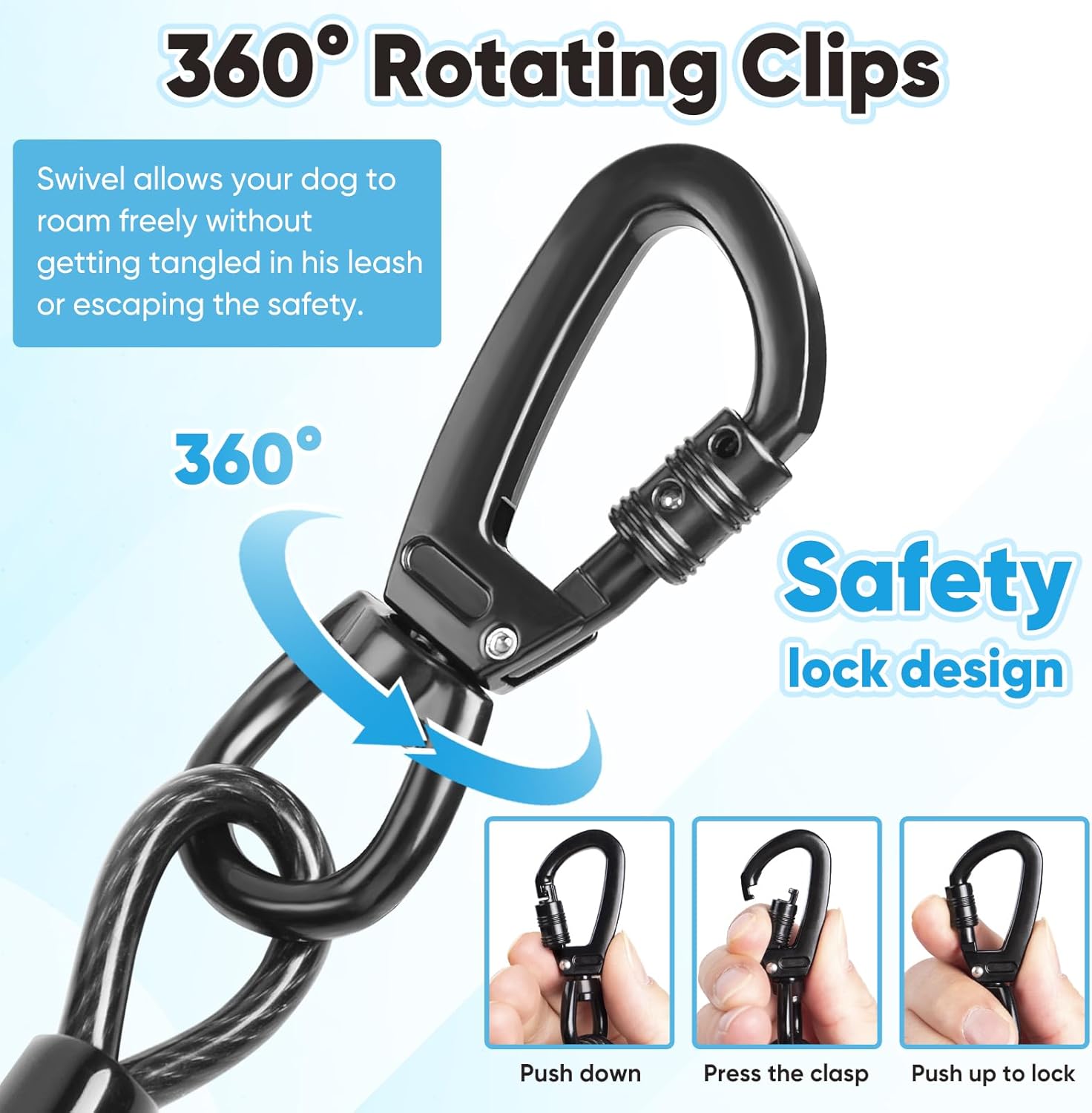 【WITH 30FT DOG CABLE】The wire of the dog tie out cable is made of 4mm diameter steel wire with rust-resistant PVC coating, and the ends of the cable use upgraded 360° swivel hooks for solid durability. (Tangle free)🐾