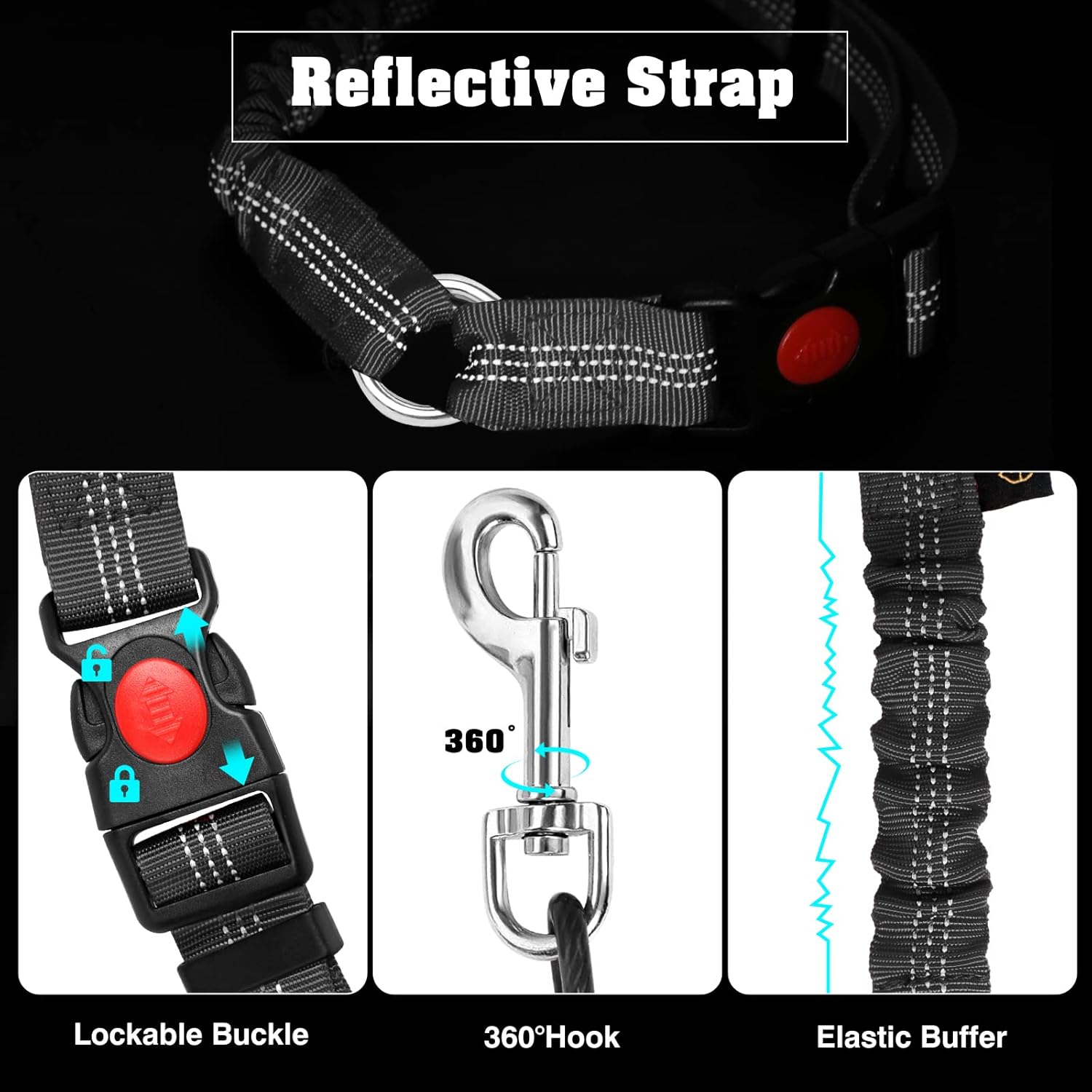 There are elastic bungees in it to make the leash shock-absorbent, effectively strengthening the protection of dogs from sudden stops or sharp turns.Two 360°rotation buckles prevents dog belt from getting tangled.