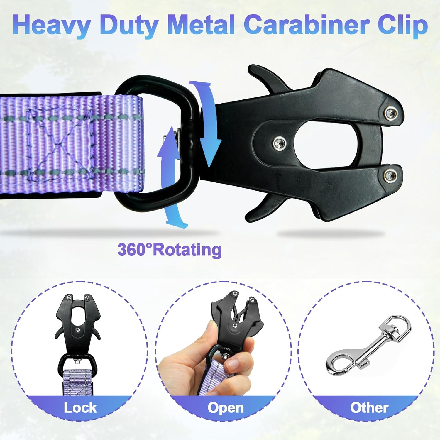 Heavy Duty Frog Clip:Made of aviation aluminum alloy, Quick release and locking dog leash buckle, it can be tightly fastened even under strong pulling, no worry about it being pulled off or opened accidentally. Rotates 360° to prevent twisting and knotting of the leash and holds up to 500 lbs