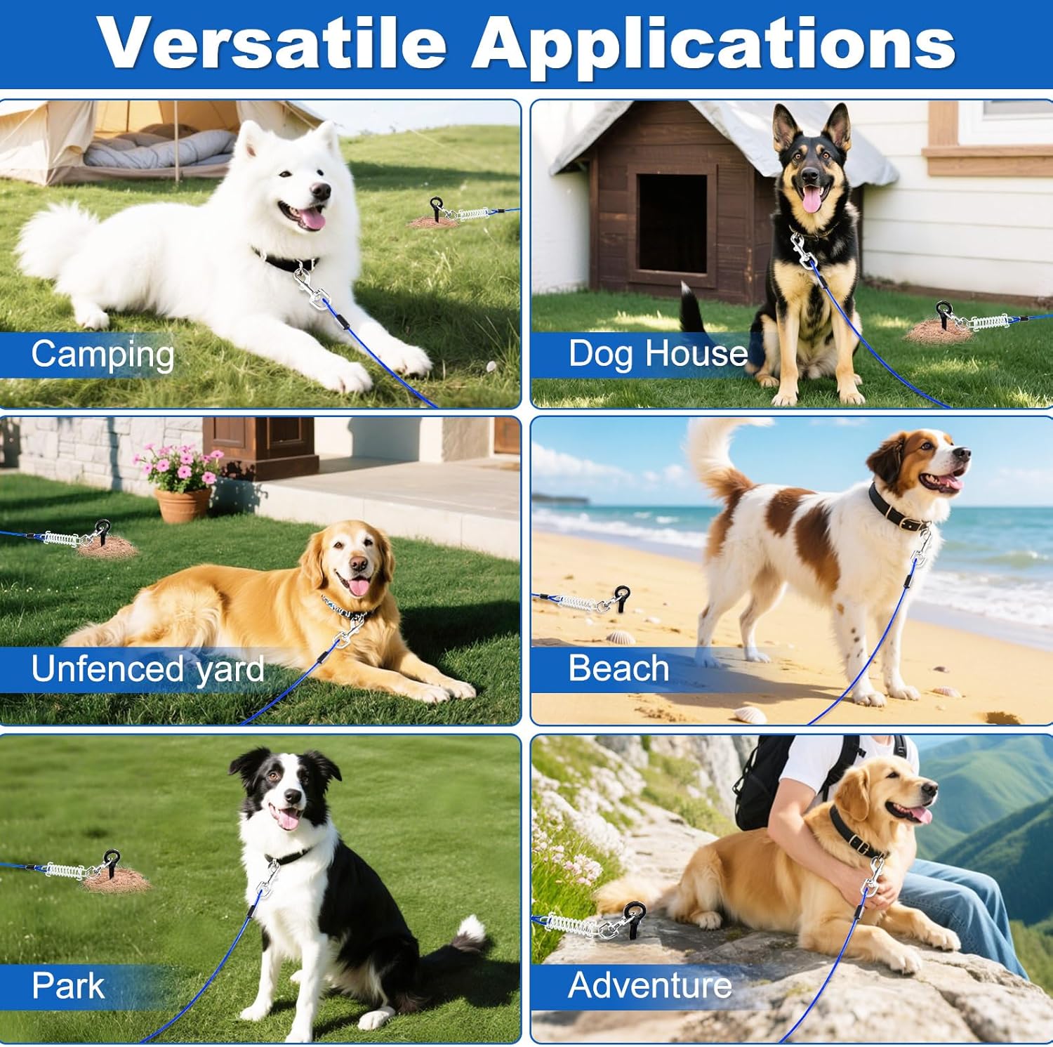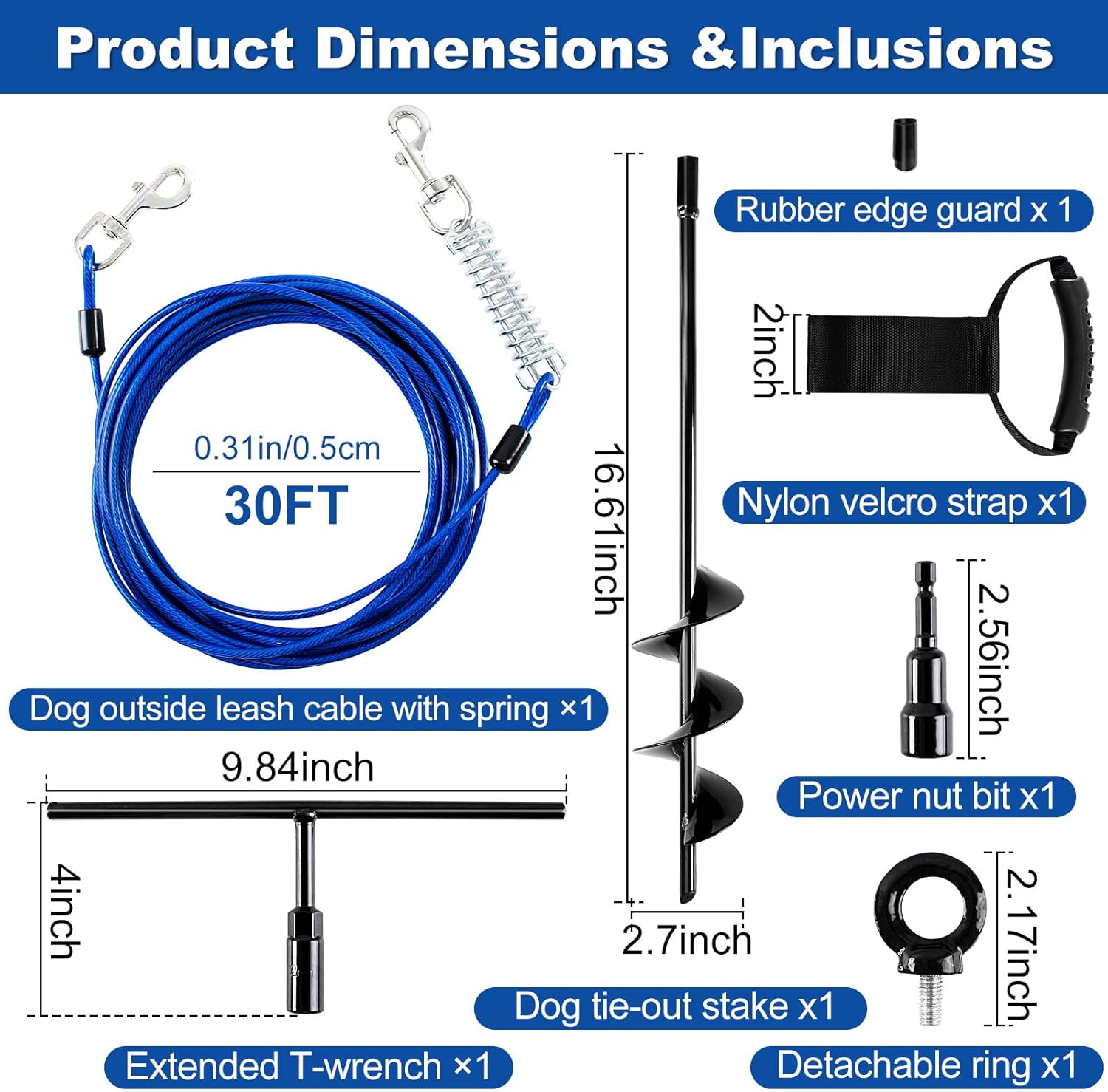 𝐏𝐚𝐜𝐤𝐚𝐠𝐞 𝐈𝐧𝐜𝐥𝐮𝐝𝐞𝐬:17-inch ground anchors & stakes(extended T-wrench,12mm power nut drill bit,detachable ring)+30ft anti-shock dog tie out cable with nylon Velcro strap.Complete accessories—no extra purchases.Perfect for dogs 30-125 lbs in camping,yard and beach.