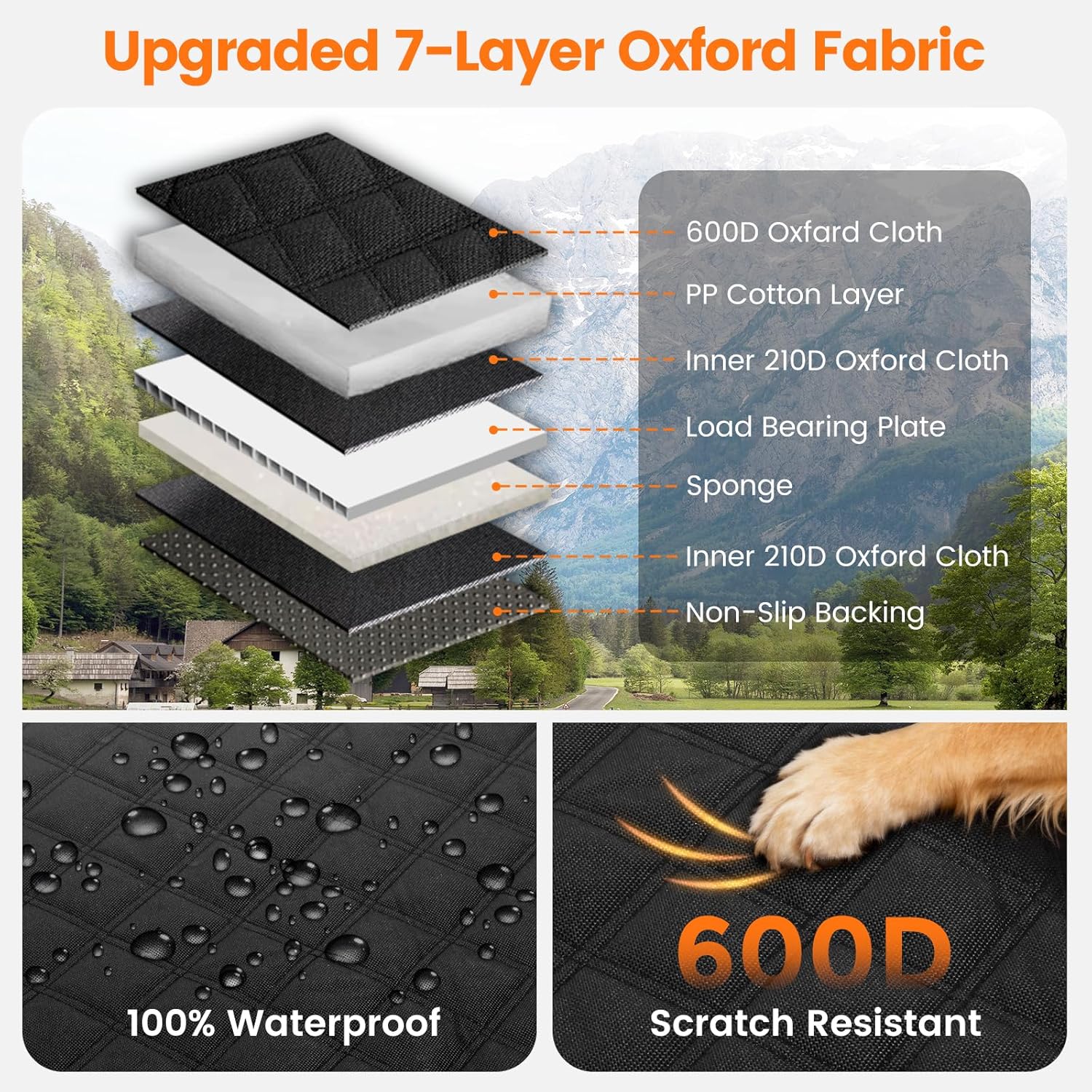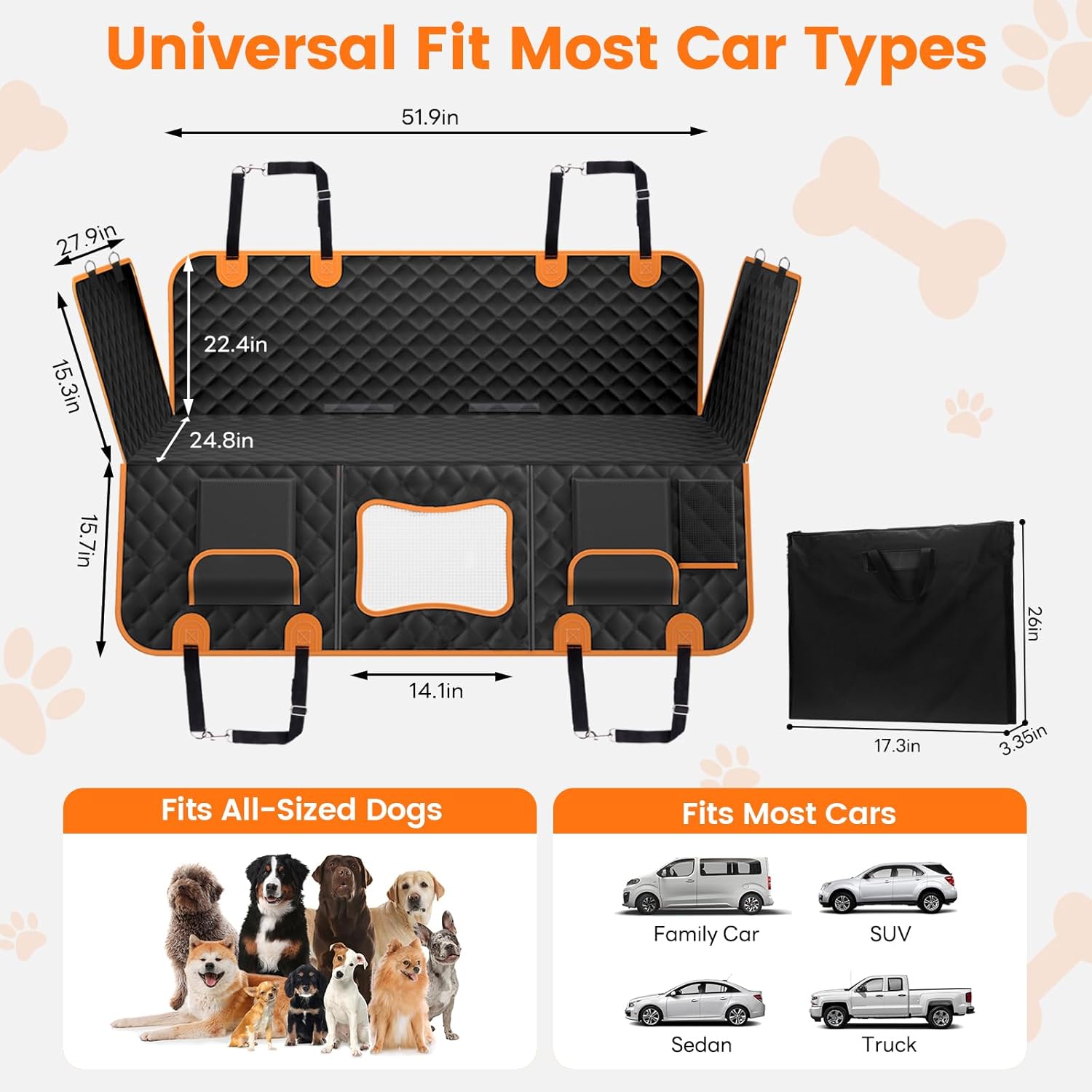 Waterproof and Scratch-Resistant: This back seat pet cover for dogs combines a 7-layer reinforced design (600D Oxford Cloth, PVC waterproof coating, EVA non-slip base,35D cotton). The dog car seat cover for back seat protects your seats from dog hair, drool, waste and scratching claws, making dogs comfortable on car journeys. It’s the perfect choice for road trips, the beach, or camping adventures