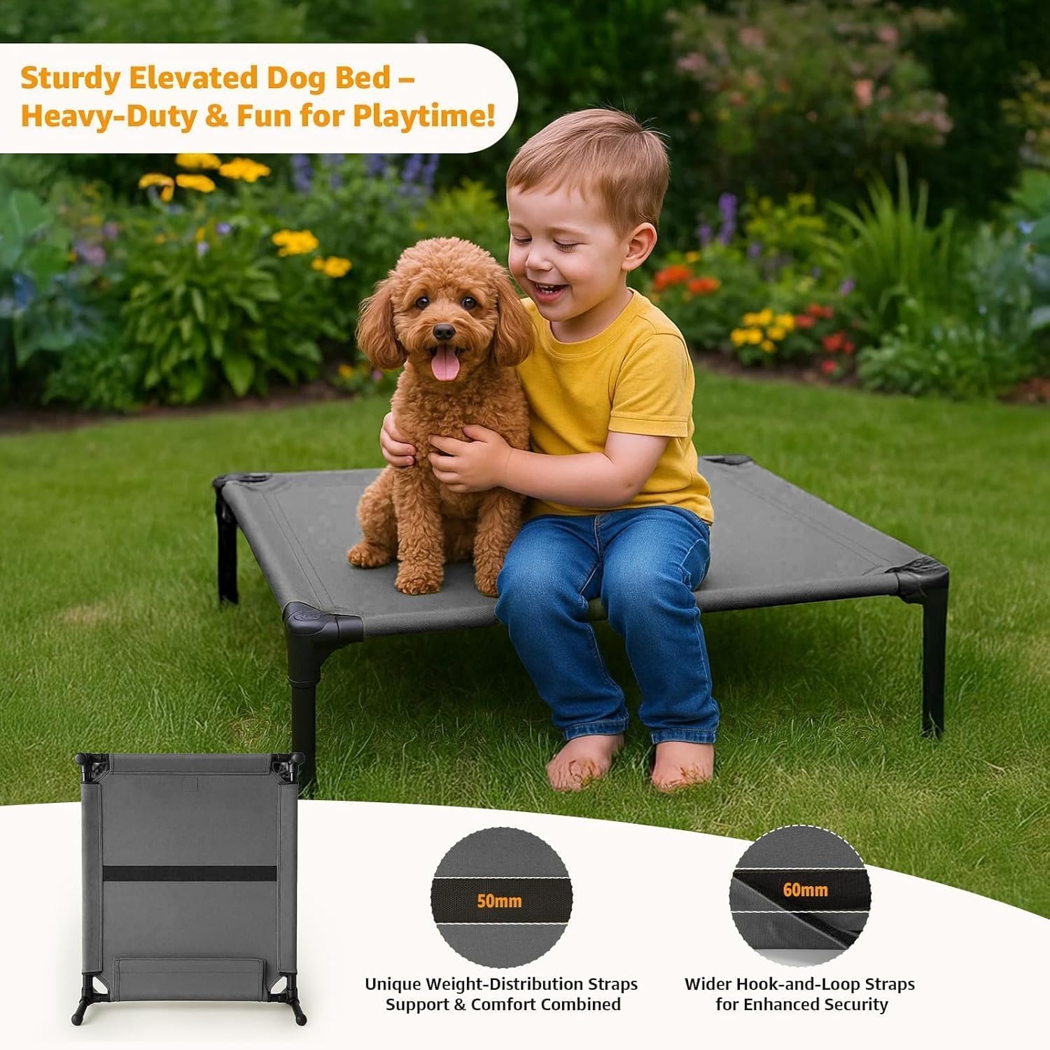 🧼 Easy Assembly & Simple Cleaning: Quick, tool-free assembly and a removable, washable waterproof canvas cover make setup and cleaning effortless. Canvas dries fast and resists stains and moisture, so you spend less time on chores and more time with your pet—at home or outdoors.