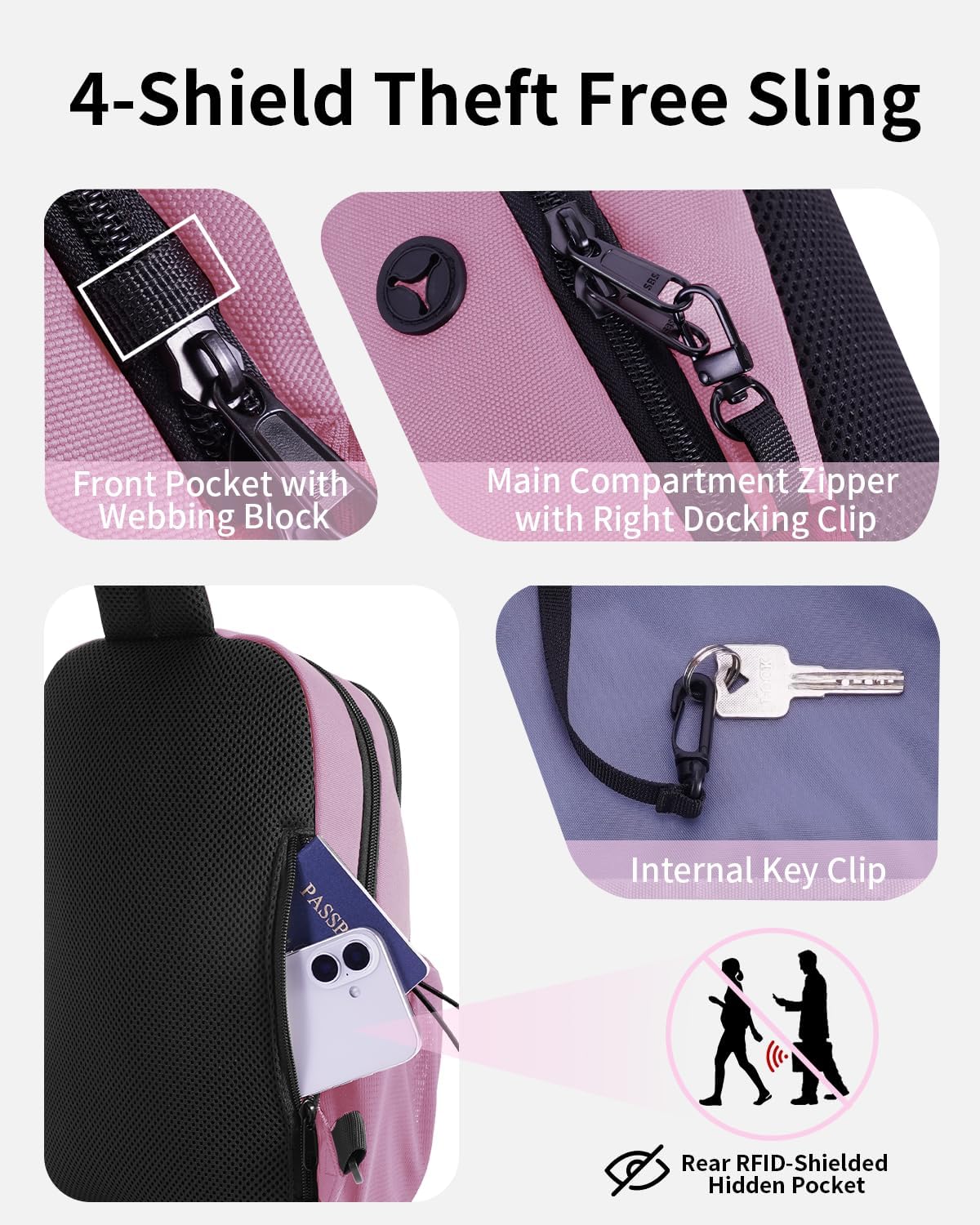 【Security & Anti-Theft Design】4-Layer Anti-Theft System Features theft-deterrent details: lockable main compartment zipper, anti-pick secondary compartment clasp, slash-resistant fabric, and an inner key leash. Includes a hidden RFID-blocking pocket to protect cards/IDs from electronic scanning